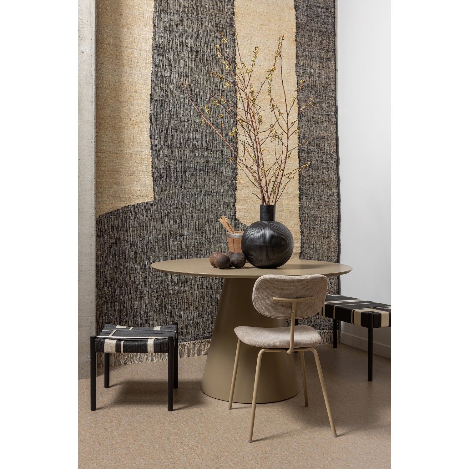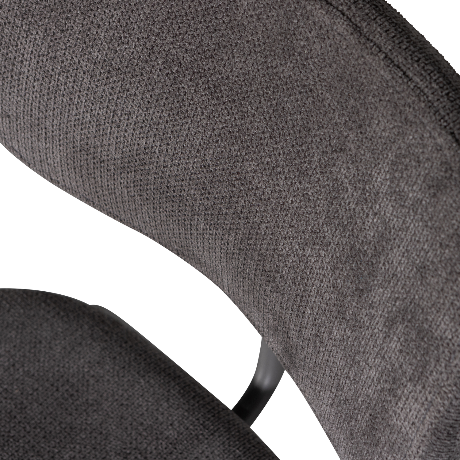 De eetkamerstoel uit de Exclusive collectie van het Nederlandse interieurmerk WOOOD heeft een slank metalen onderstel, gecoat in een bruin/grijze tint. De zitting is bekleed met een matglanzende, zachte ribstof met een opvallend kronkelend banenpatroon: modern, comfortabel en gemakkelijk te combineren aan de eettafel.