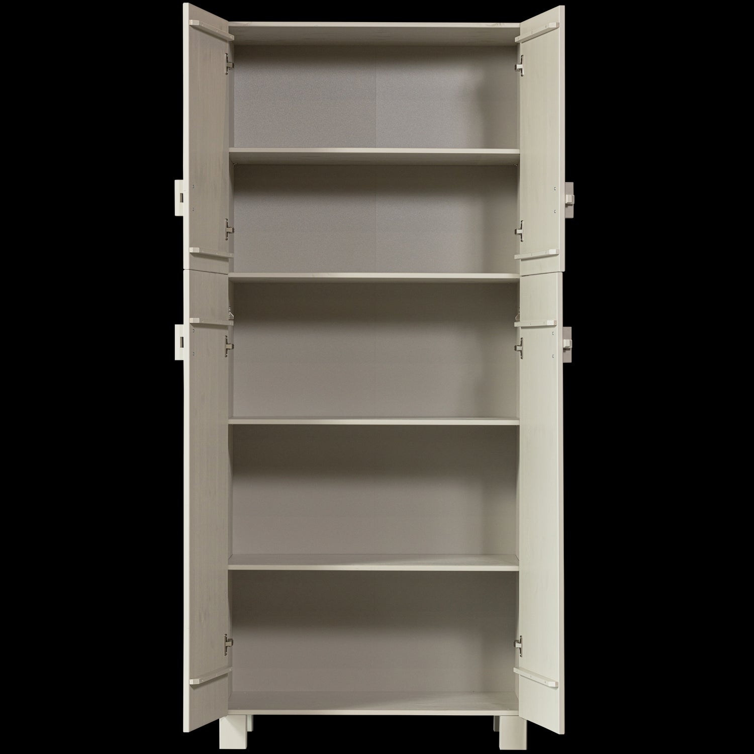 Het interieur van de Mees 4-deurs kast is gevormd uit grenenhout afgewerkt in een frisse kleur: dust.