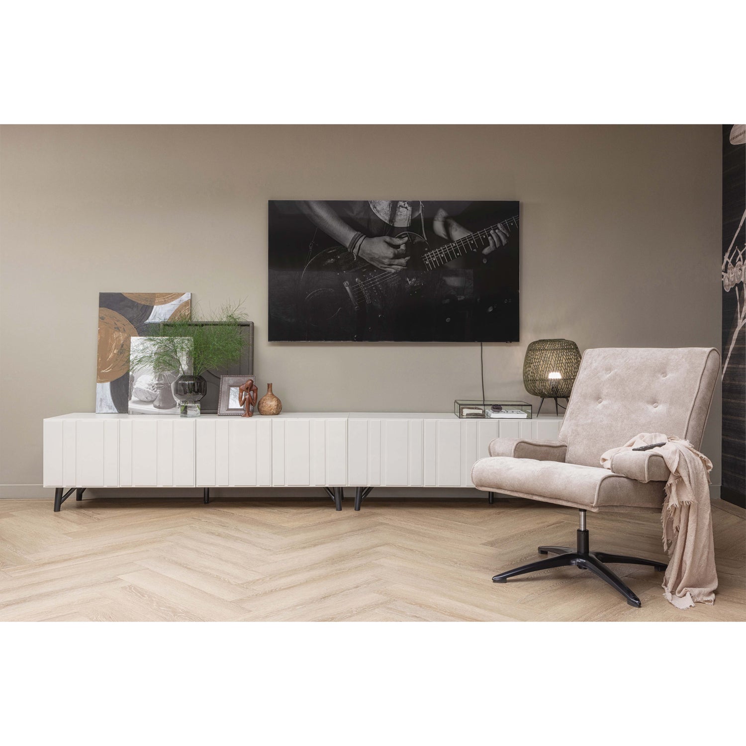 Een clean design, grafisch lijnenspel en een spannend kleurcontrast. Dat zijn de kenmerken van de Miller-serie uit de Exclusive collectie van het Nederlandse interieurmerk WOOOD. De mistwitte afwerking houdt het ontwerp stijlvol en modern met als spannende tegenhanger de stoere, stevige zwarte poten. Het lijnenspel maakt dat elk item uit de Miller-serie slankt oogt en zich gemakkelijk in jouw interieurstijl laat voegen.
