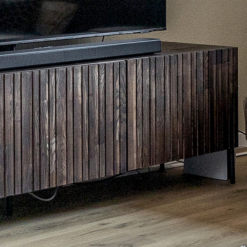 Design met slimme opbergruimte Achter de twee greeploze deuren – voorzien van een geluidloos push-to-open systeem – vind je zes vakken met ruimte voor media-apparatuur, kabels en meer. Een slimme kabeluitsparing aan de achterzijde maakt het aansluiten van apparatuur eenvoudig en netjes.