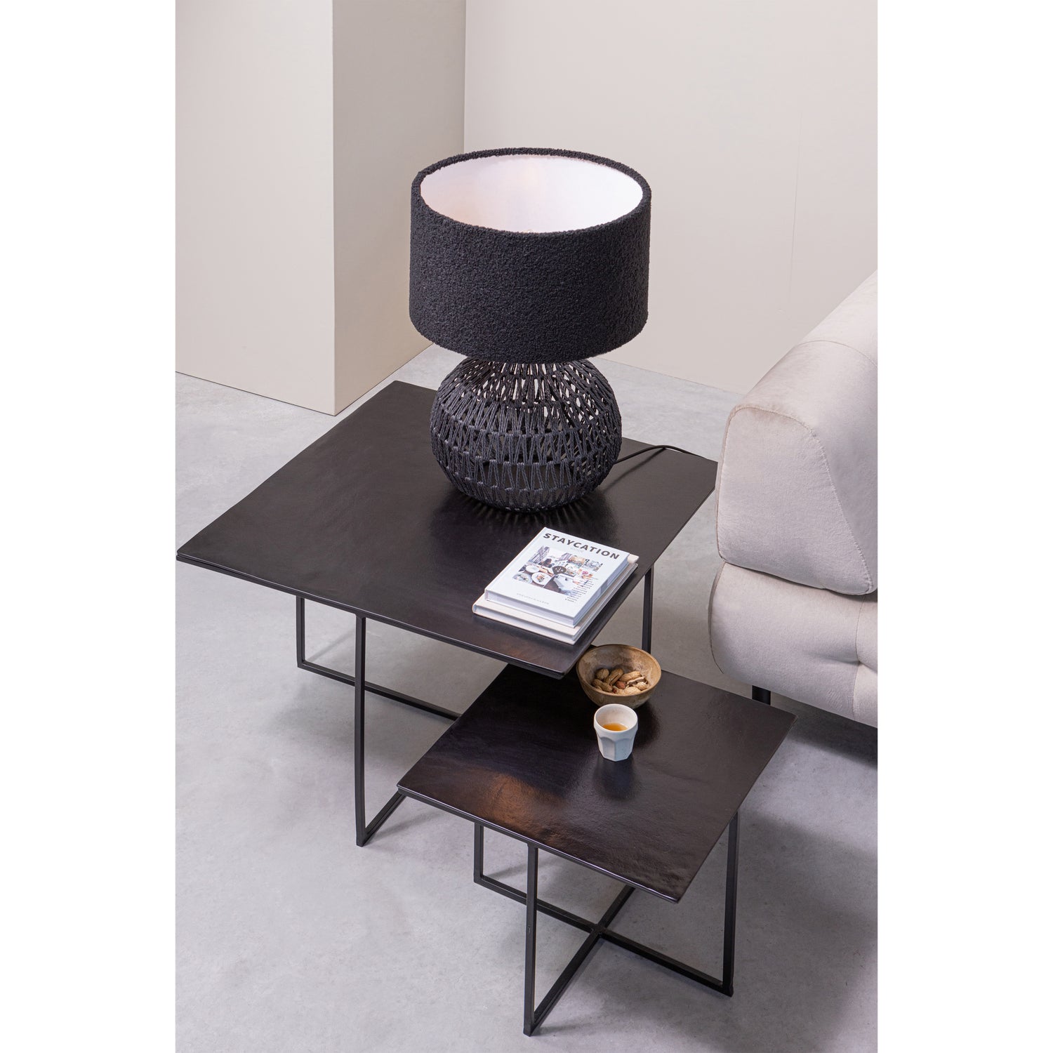 De Olan bijzettafelset van het Nederlandse merk WOOOD is een stijlvolle toevoeging aan ieder interieur. Met hun warme, donkere tint en robuuste metalen bewerking zorgen deze tafels voor een gezellige en toch stoere sfeer in huis. Het veelzijdige ontwerp maakt ze geschikt voor uiteenlopende woonstijlen. De tafels kunnen los van elkaar gebruikt worden of deels onder elkaar geschoven worden voor een speelse dynamiek in de ruimte.