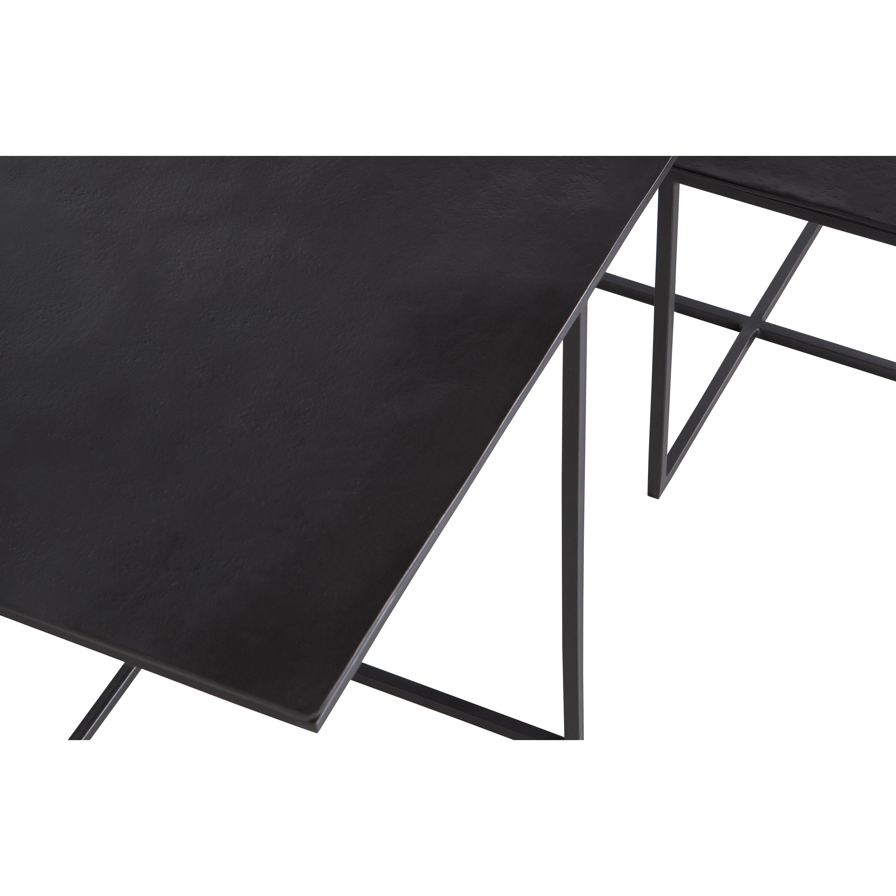 De Olan tafels zijn vervaardigd uit sterk metaal en afgewerkt in een warme, donkerbruine tint. De metalen afwerking is robuust bewerkt, wat zorgt voor een geleefde uitstraling en een uniek karakter. De kruispoten van het frame geven de tafels een elegant accent.