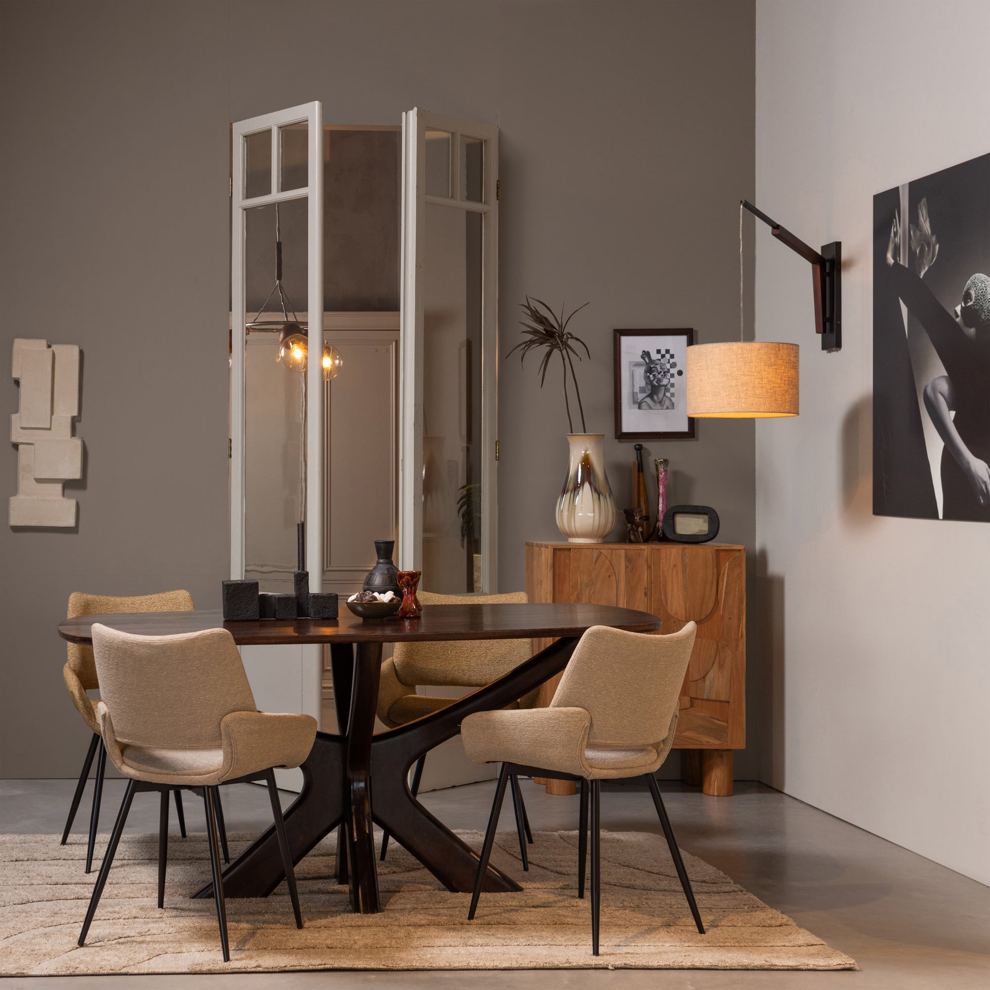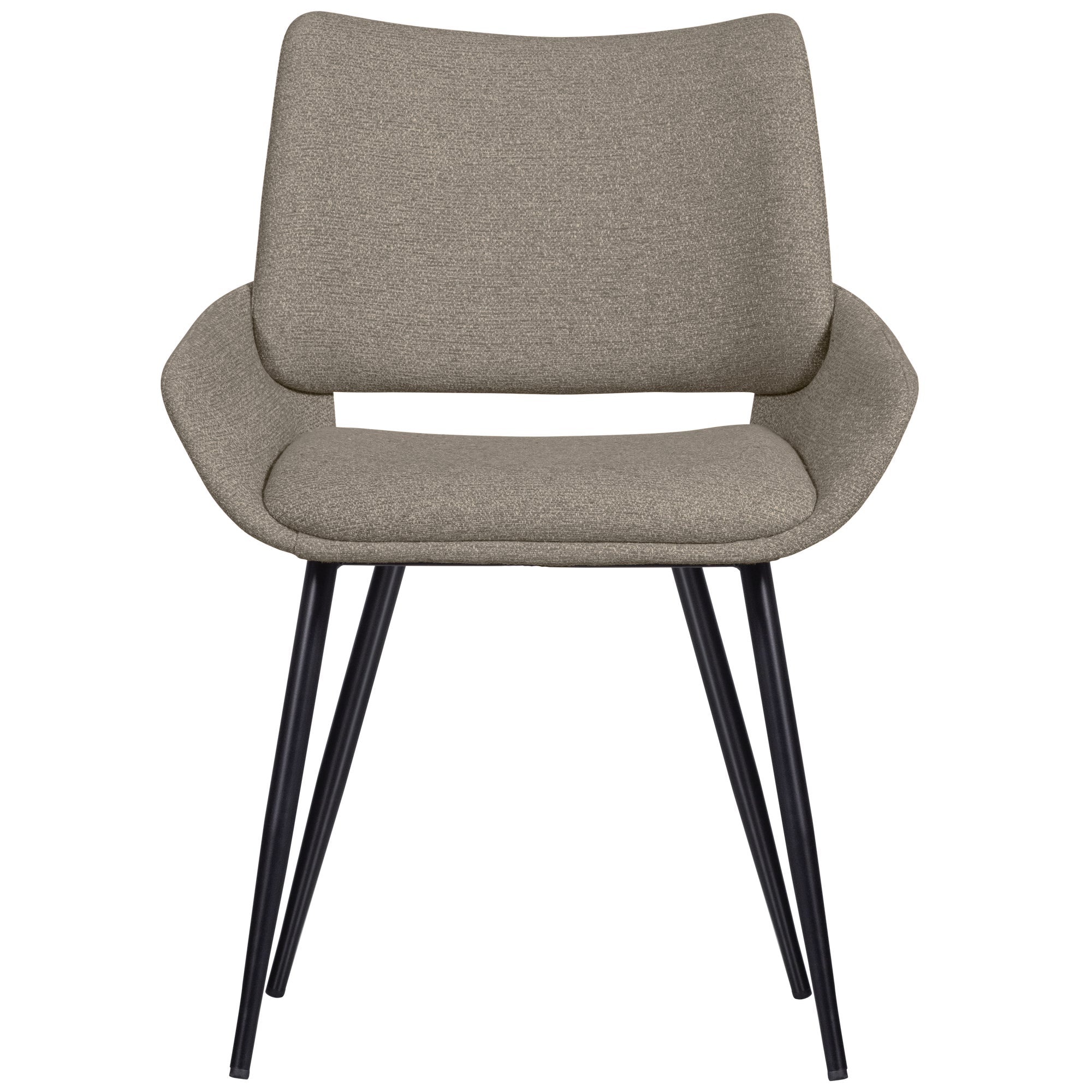 De Parade eetkamerstoel, uit de collectie van het Nederlandse interieurmerk WOOOD, heeft een subtiele kuipvormige zitting bekleed met een warme melangestof. De conische metalen poot geeft de stoel een luchtige uitstraling. Materiaal
