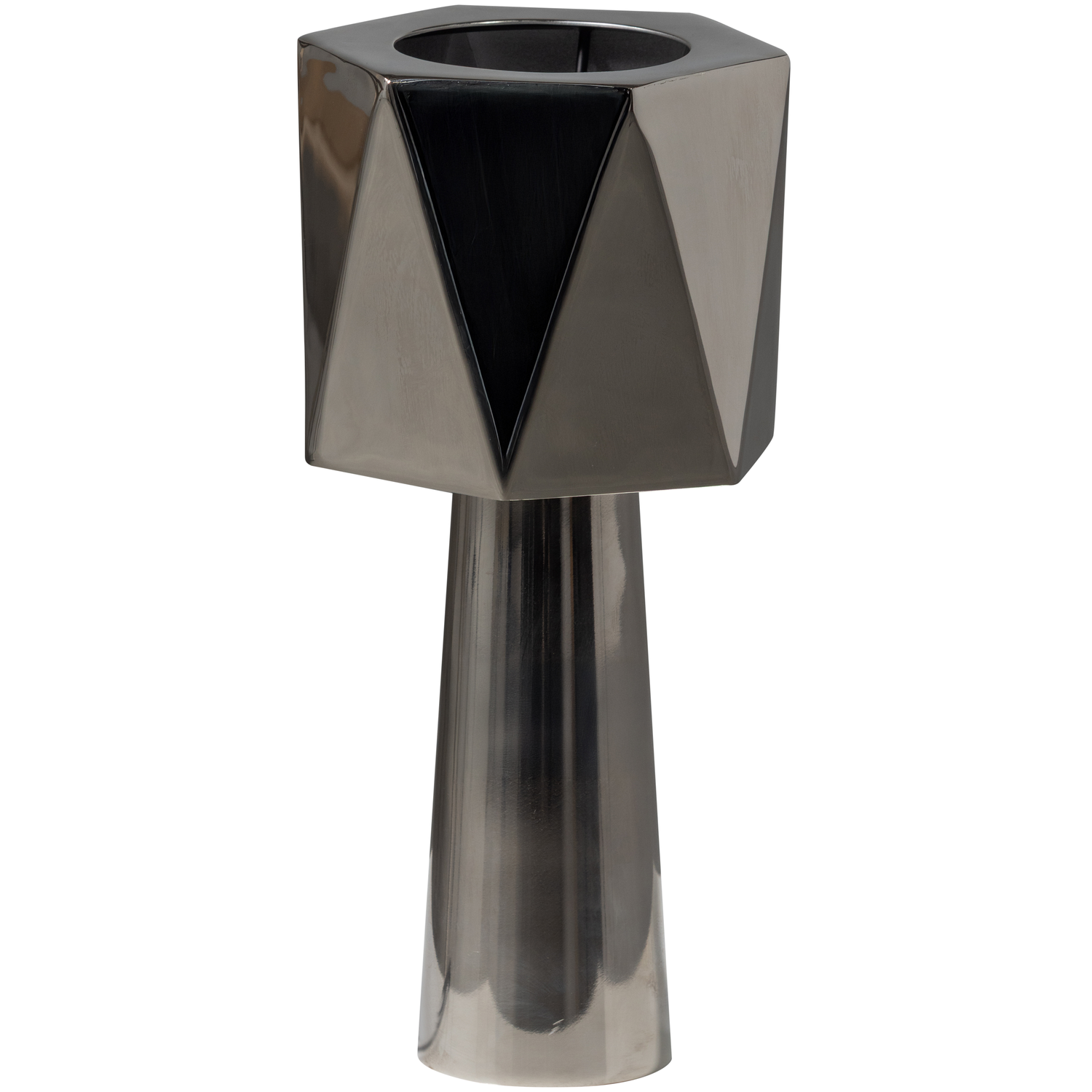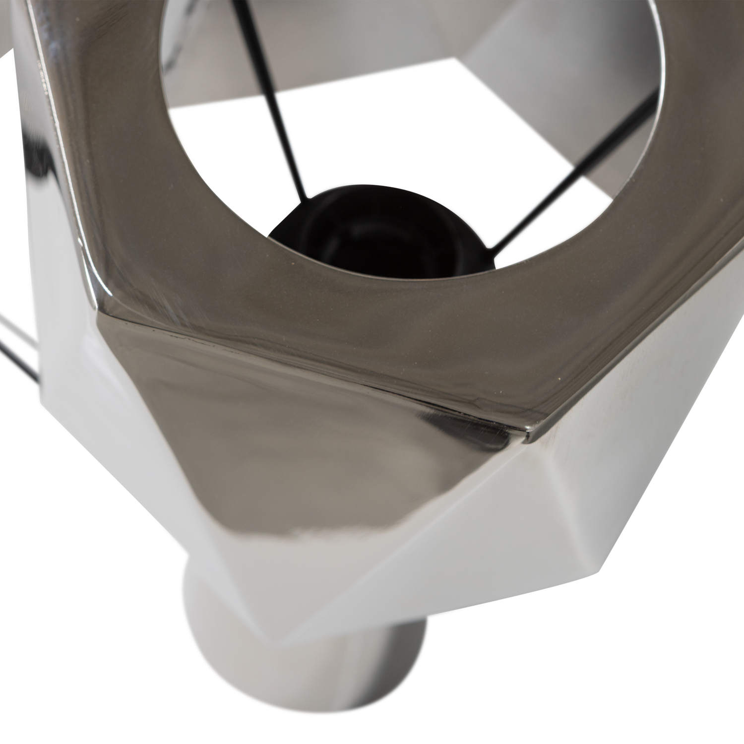 Deze unieke tafellamp komt uit de collectie van het Nederlandse interieurmerk WOOOD. Compact van formaat, groots in uitstraling , deze eyecatcher trekt gegarandeerd de aandacht. Het speelse geometrische design in glanzend chroomkleurig metaal geeft de lamp een moderne en luxe look. Of het licht nu aan of uit is: deze lamp voegt altijd karakter toe aan je interieur.