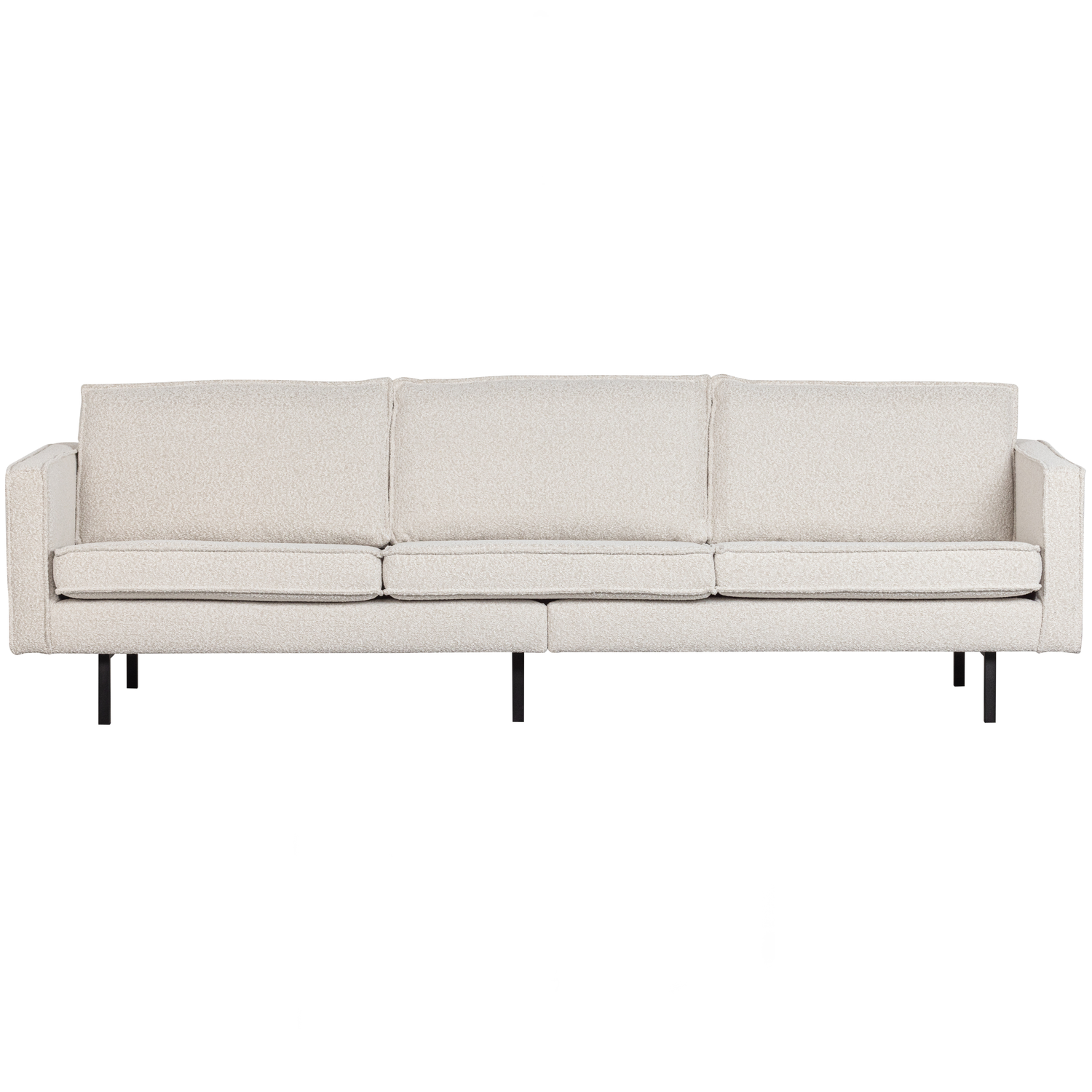 De Rodeo bank is opgebouwd uit een combinatie van massief hout, spaanplaat, polyurethaan schuim met een dichtheid van 25 kg/m3 en een zigzag vering. De zitting bevat een polyurethaan schuim met een dichtheid van 30 kg/m3 (T3037). De rugleuning bestaat uit een combinatie van 70% gesneden schuim en 30% siliconen. Deze Rodeo is bekleed met zachte bouclé. Het materiaal van de Colmar bouclé stof speelt in op de laatste trend: zachte materialen. De stof is zacht en heeft een elegante textuur die meteen warmte in huis brengt. Onze Colmar bouclé stof heeft een Martindale van 100.000, dat betekent dat de stof geschikt is voor intensief gebruik. De dichte weeftechniek zorgt voor de sterkte van de stof, dit maakt dat de bouclé niet snel zal slijten of scheuren. Ook heeft elke kleur een hoge kleurvastheid, maar het is aangeraden om direct zonlicht te vermijden om kleurnuances te voorkomen.