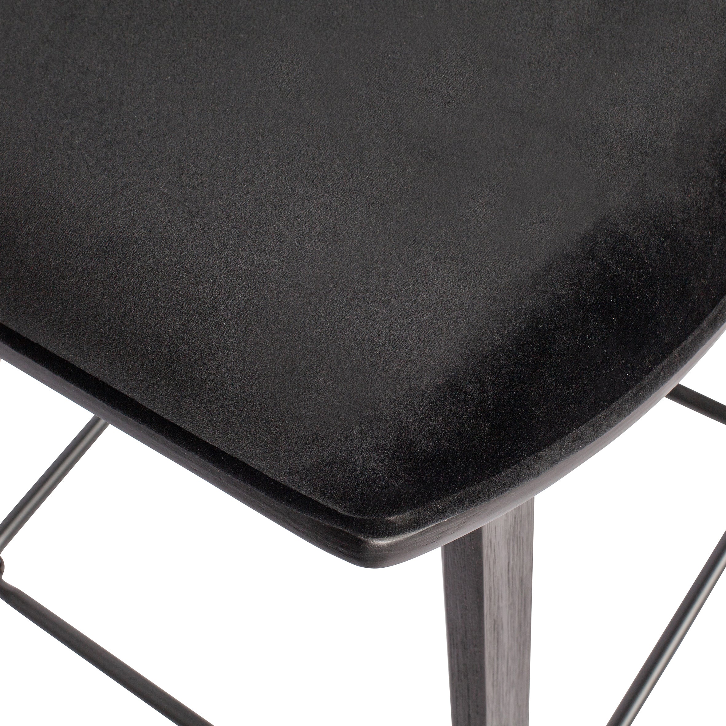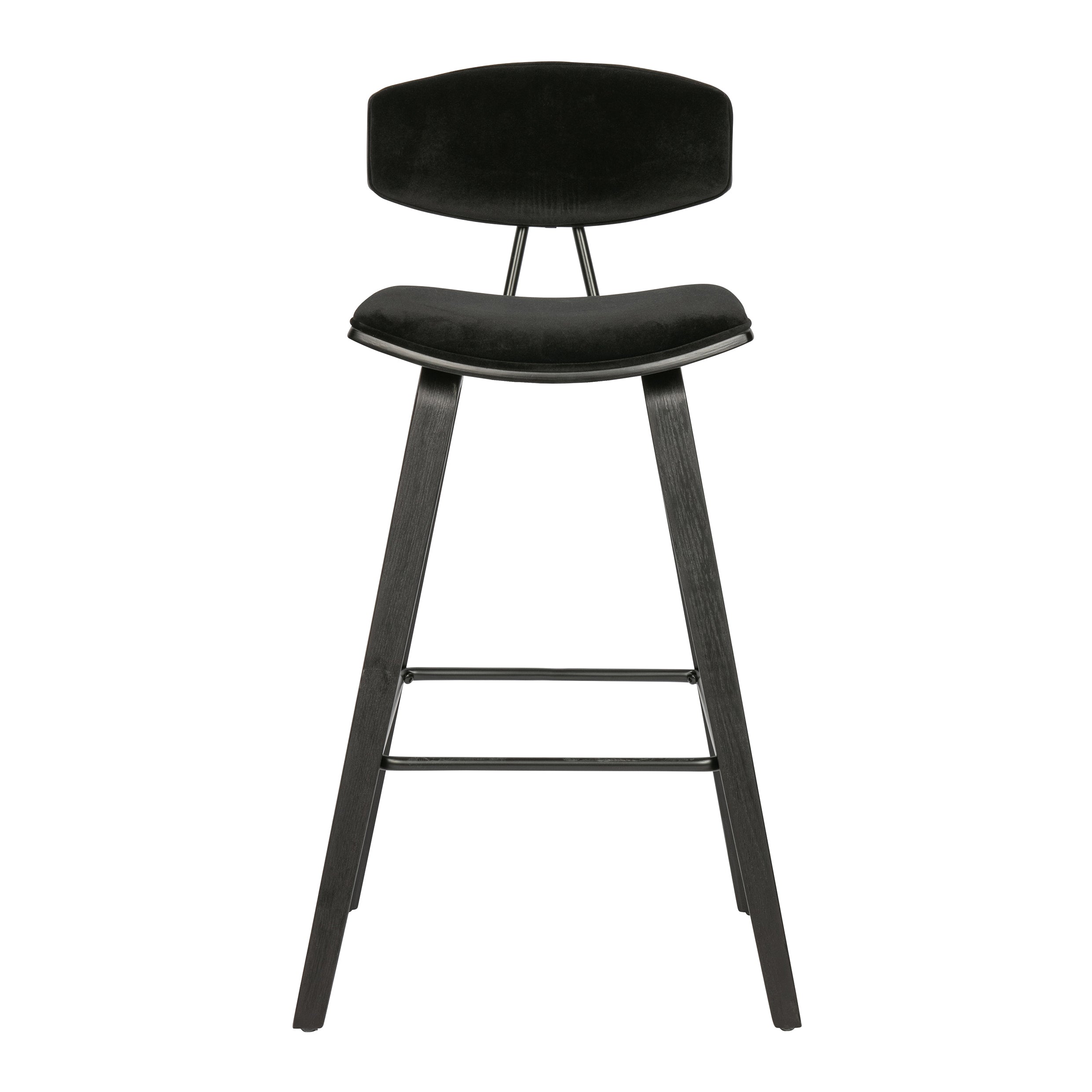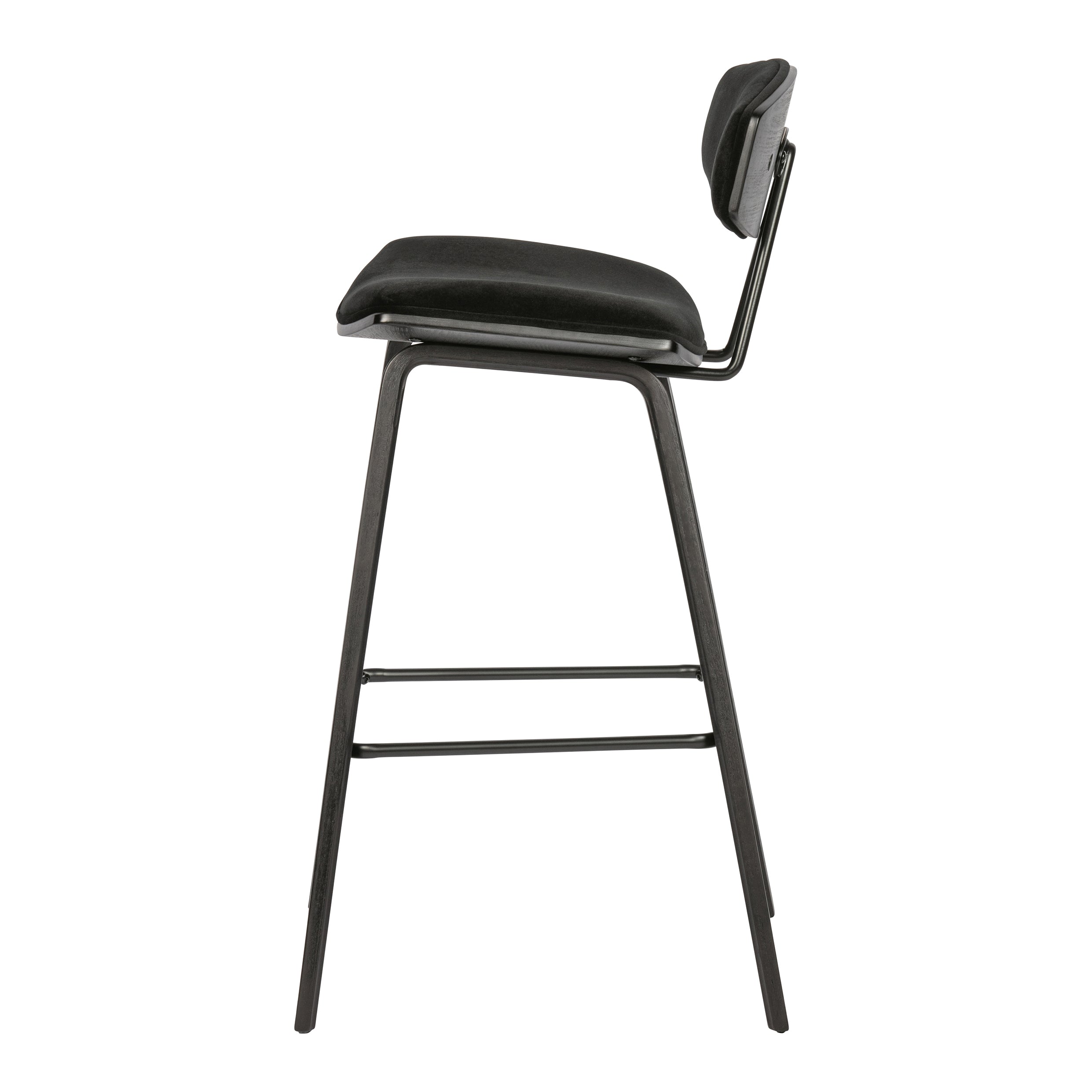 Materiaal De Senn barstoel is gevormd uit multiplex afgewerkt in matzwart. De zitting en rugleuning is bekleed met een zwarte, lichtglanzende velvet. Onze Dianiet velvet is een matglanzende, royale korte velours. De gebreide stof heeft een zeer zachte, volle grip en een rijke uitstraling. Dianiet is opgebouwd uit 100% polyester en heeft een Martindale van 40.000, de stof is hierdoor slijt- en kleurvast. Gebreide stoffen zijn altijd iets rekbaar en hierdoor zeer geschikt voor een strakke meubelstoffering.