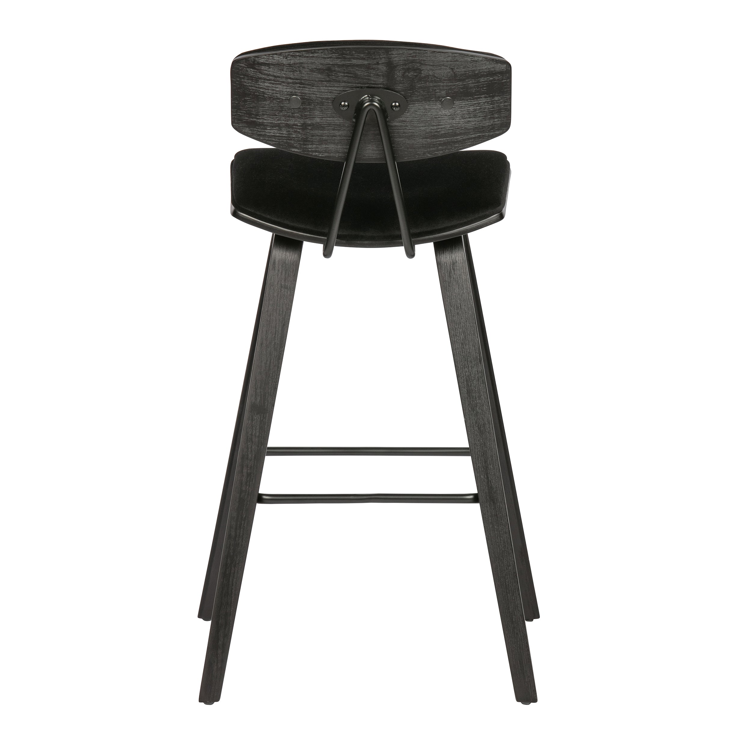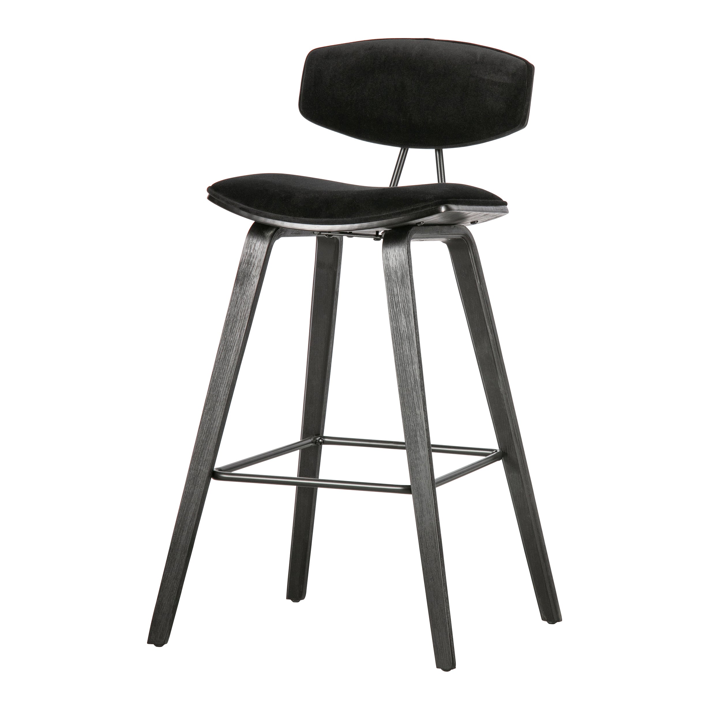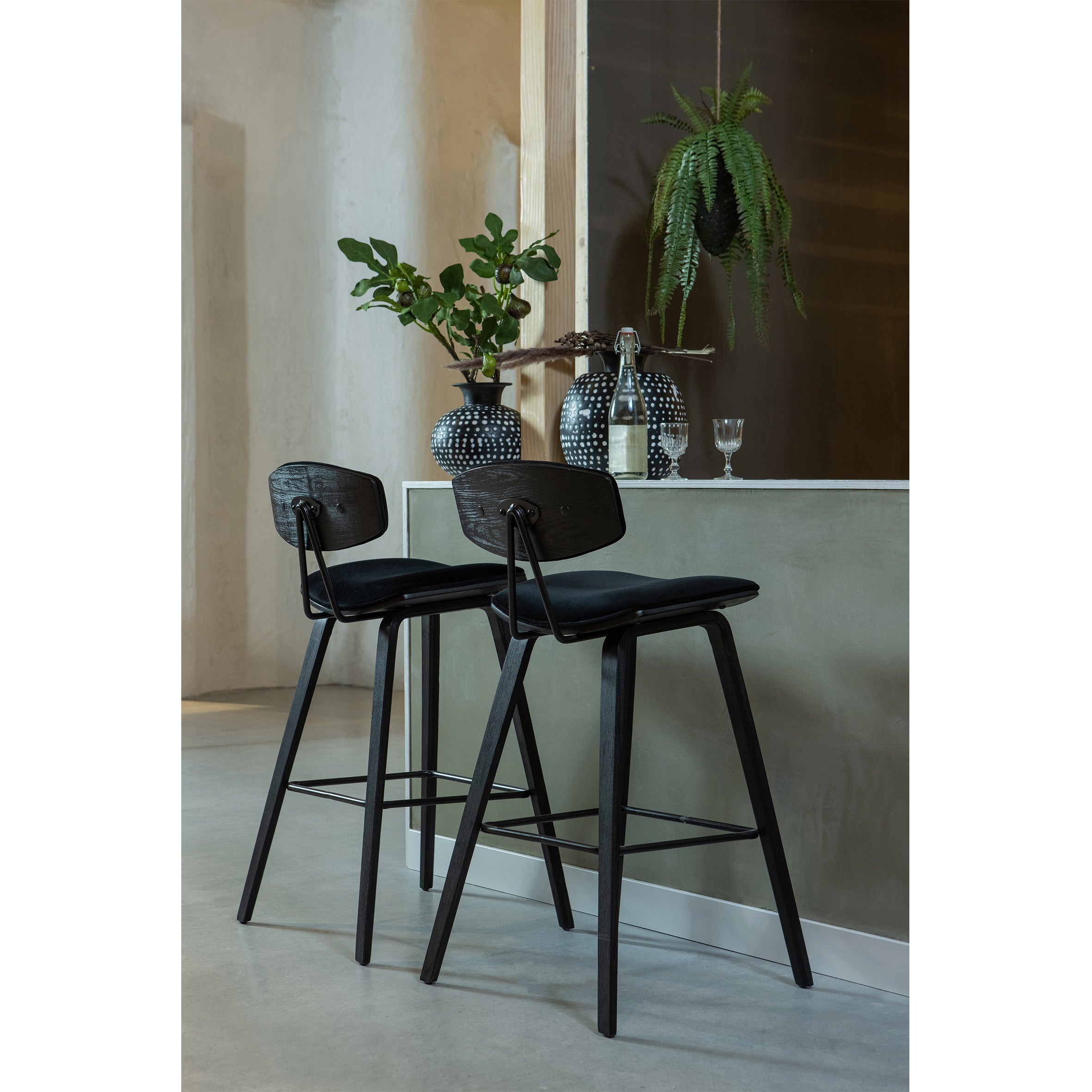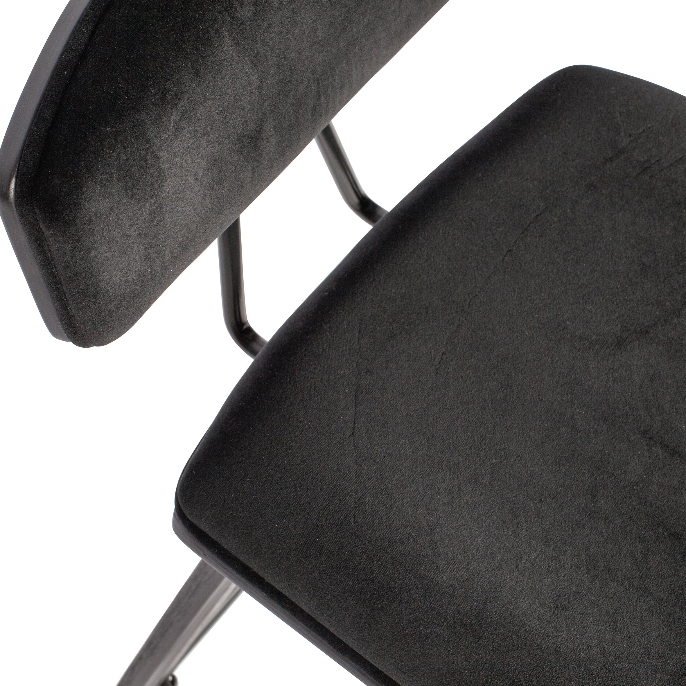 Materiaal De Senn barstoel is gevormd uit multiplex afgewerkt in matzwart. De zitting en rugleuning is bekleed met een zwarte, lichtglanzende velvet. Onze Dianiet velvet is een matglanzende, royale korte velours. De gebreide stof heeft een zeer zachte, volle grip en een rijke uitstraling. Dianiet is opgebouwd uit 100% polyester en heeft een Martindale van 40.000, de stof is hierdoor slijt- en kleurvast. Gebreide stoffen zijn altijd iets rekbaar en hierdoor zeer geschikt voor een strakke meubelstoffering.