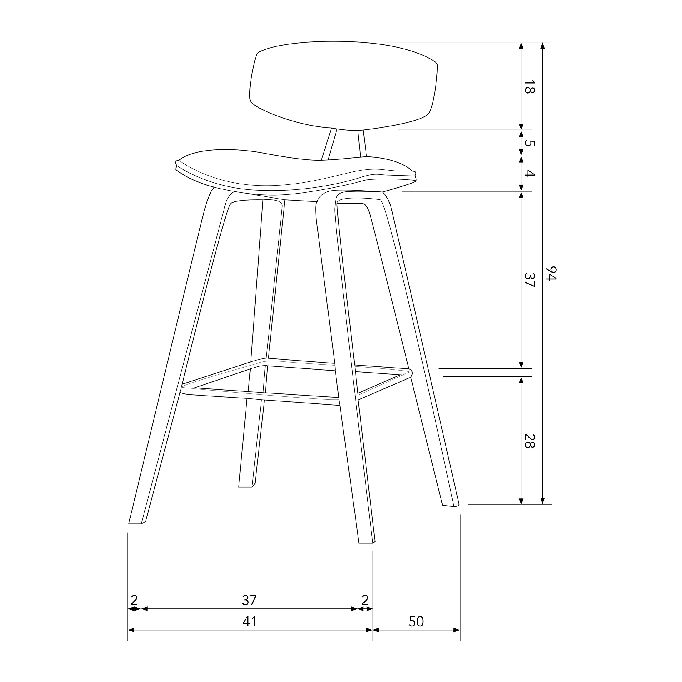 Afmetingen - Hoogte: 94 cm - Breedte: 41 cm - Diepte: 50 cm - Zithoogte: 71 cm - Zitbreedte: 41 cm - Zitdiepte: 37 cm - Rugleuning hoogte: 94/23 cm - Poothoogte: 67 cm - Pootomtrek: Ø2 cm - Hoogte voetensteun vanaf vloer: 28 cm - Gewicht: 6,5 kg - Maximale draagkracht: 150 kg
