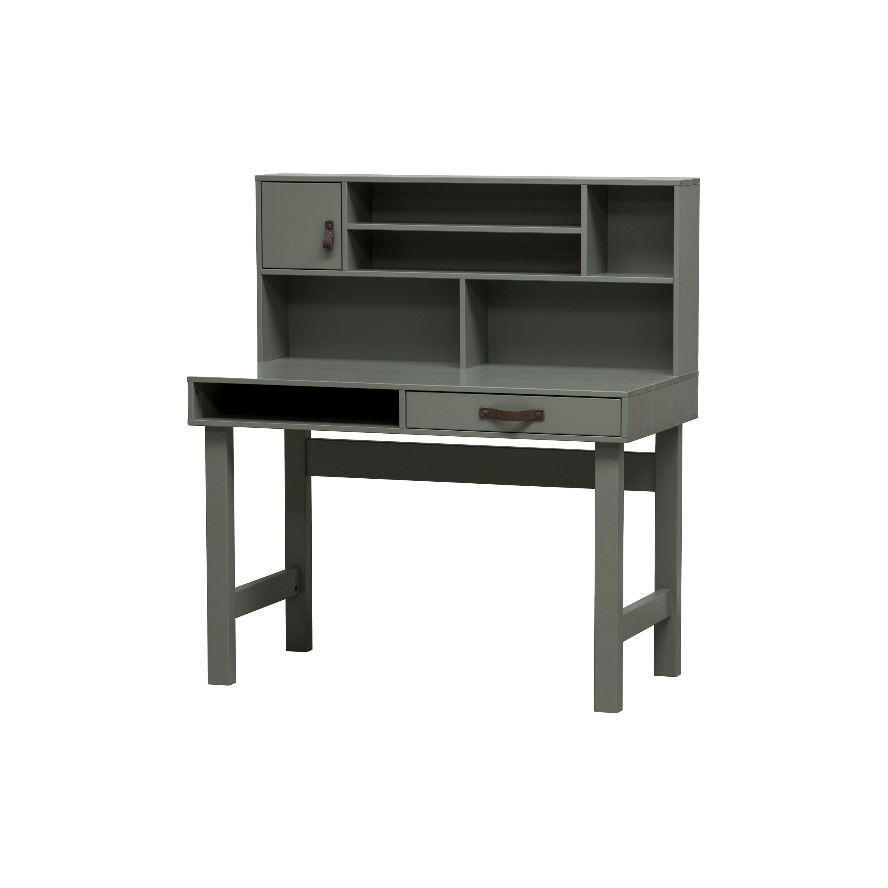 - Het deurtje en de lade hebben een leren handgreep