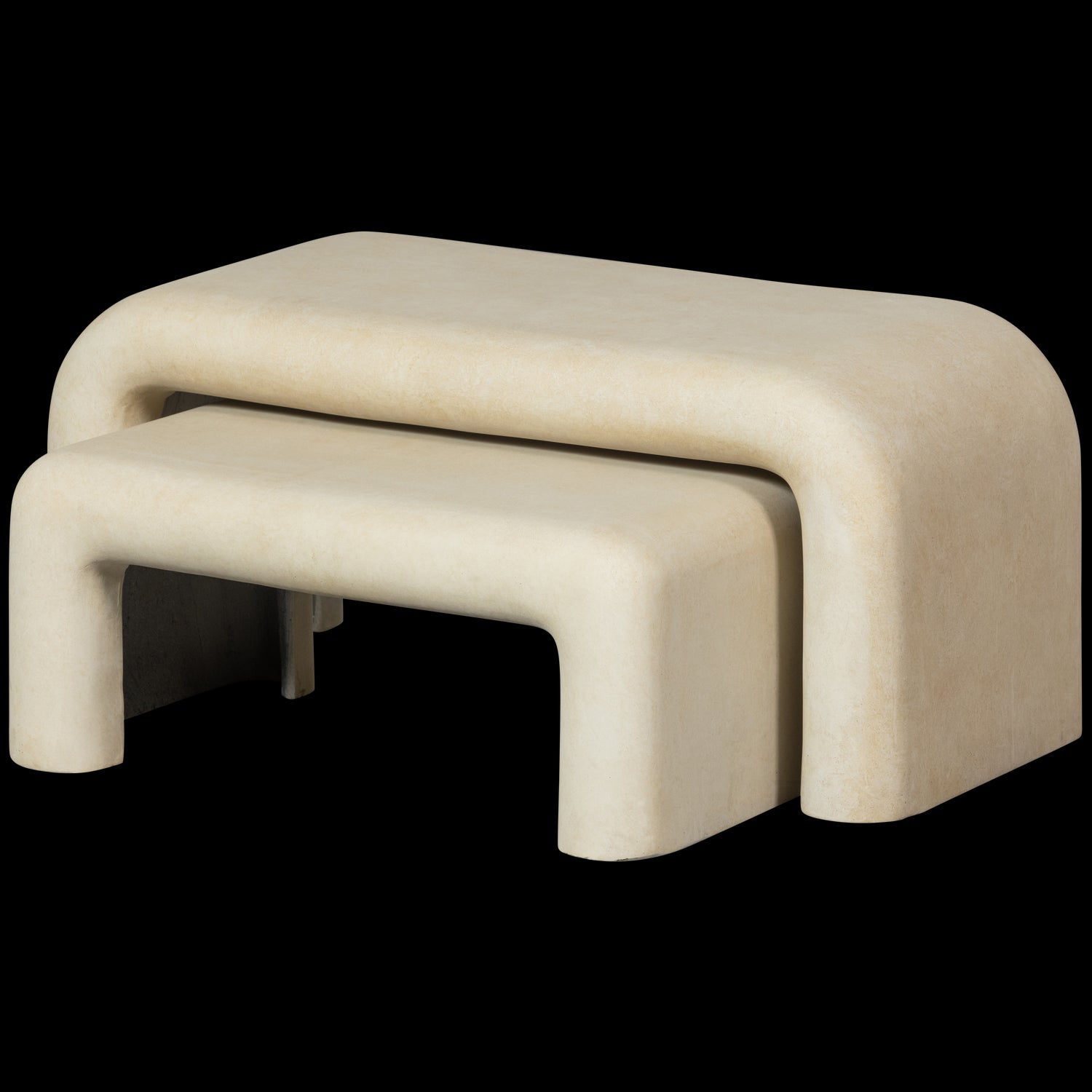 Tijdloos en eenvoudig: dat zijn de kenmerken van deze set van twee Stani bijzettafels. Deze organische set komt uit de collectie van het Nederlandse interieurmerk WOOOD en zijn vervaardigd uit een lichtgewicht betonlook, fiberclay. De naturel afwerking zorgen voor een rustige uitstraling, waardoor de tafels goed passen in een japandi of nordic woonstijl.