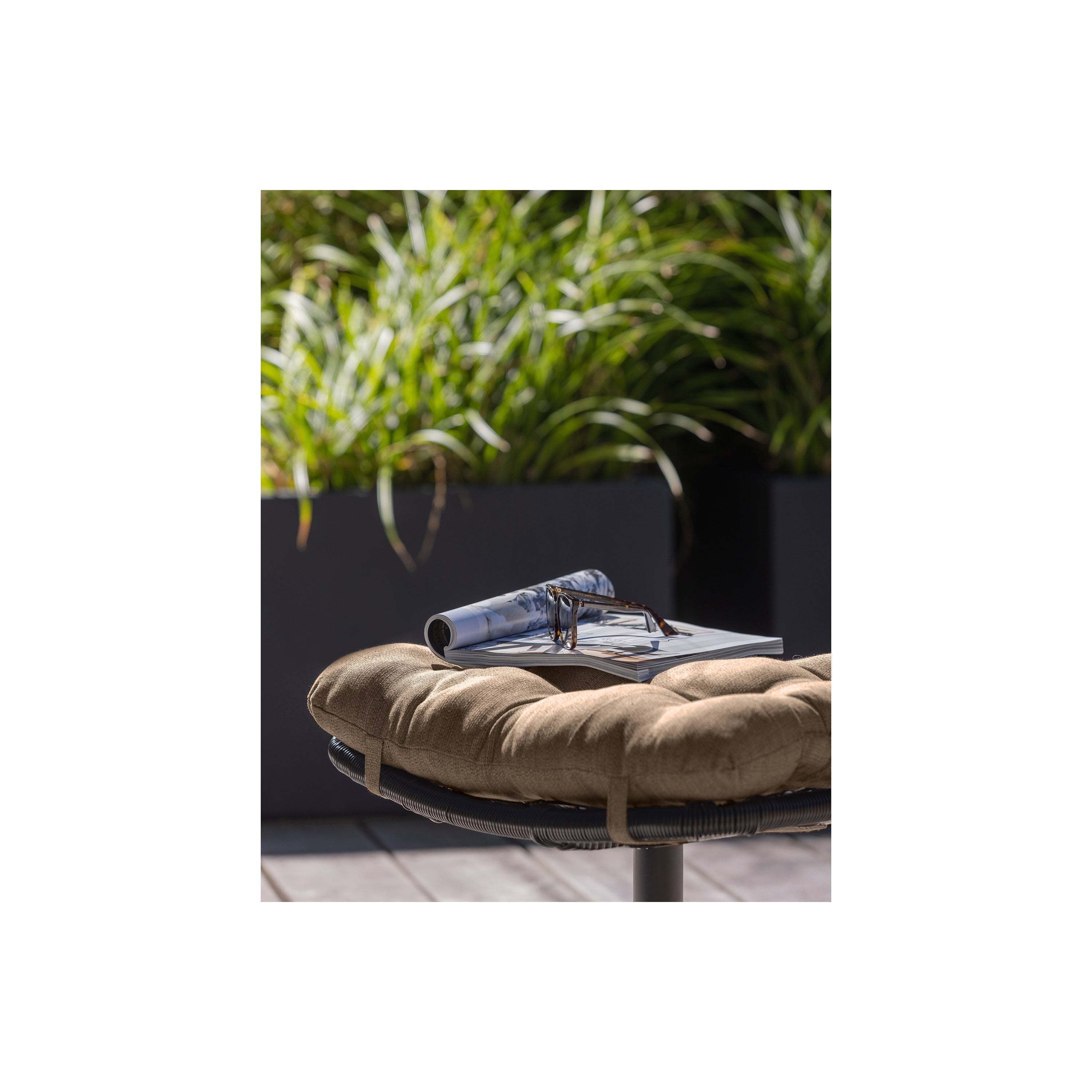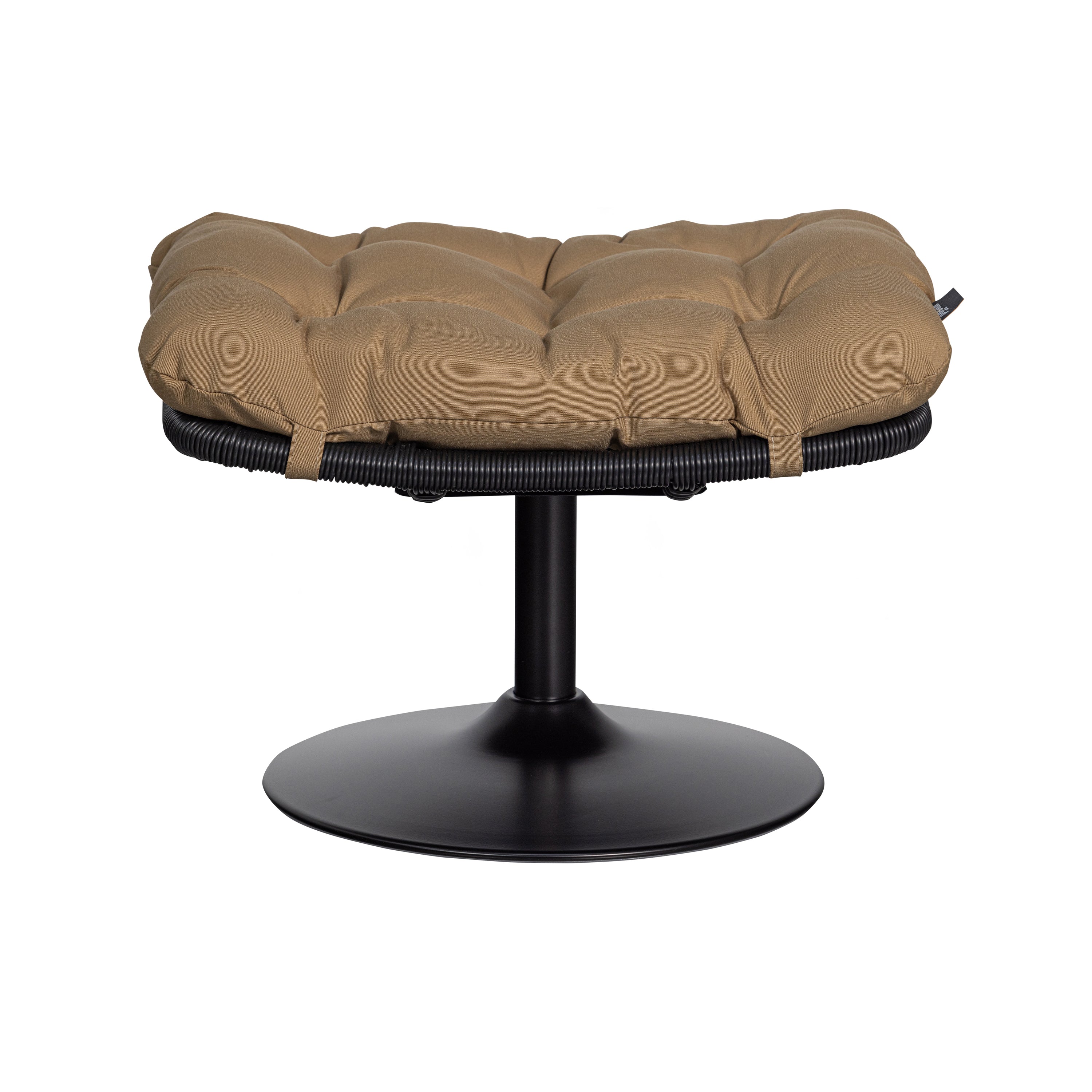 - Stijlvolle outdoor hocker met bruin kussenFrame gevormd uit zwartgekleurd rattanSlanke matzwarte trompetvoetAfmeting 63x46 cm en 37 cm hoog