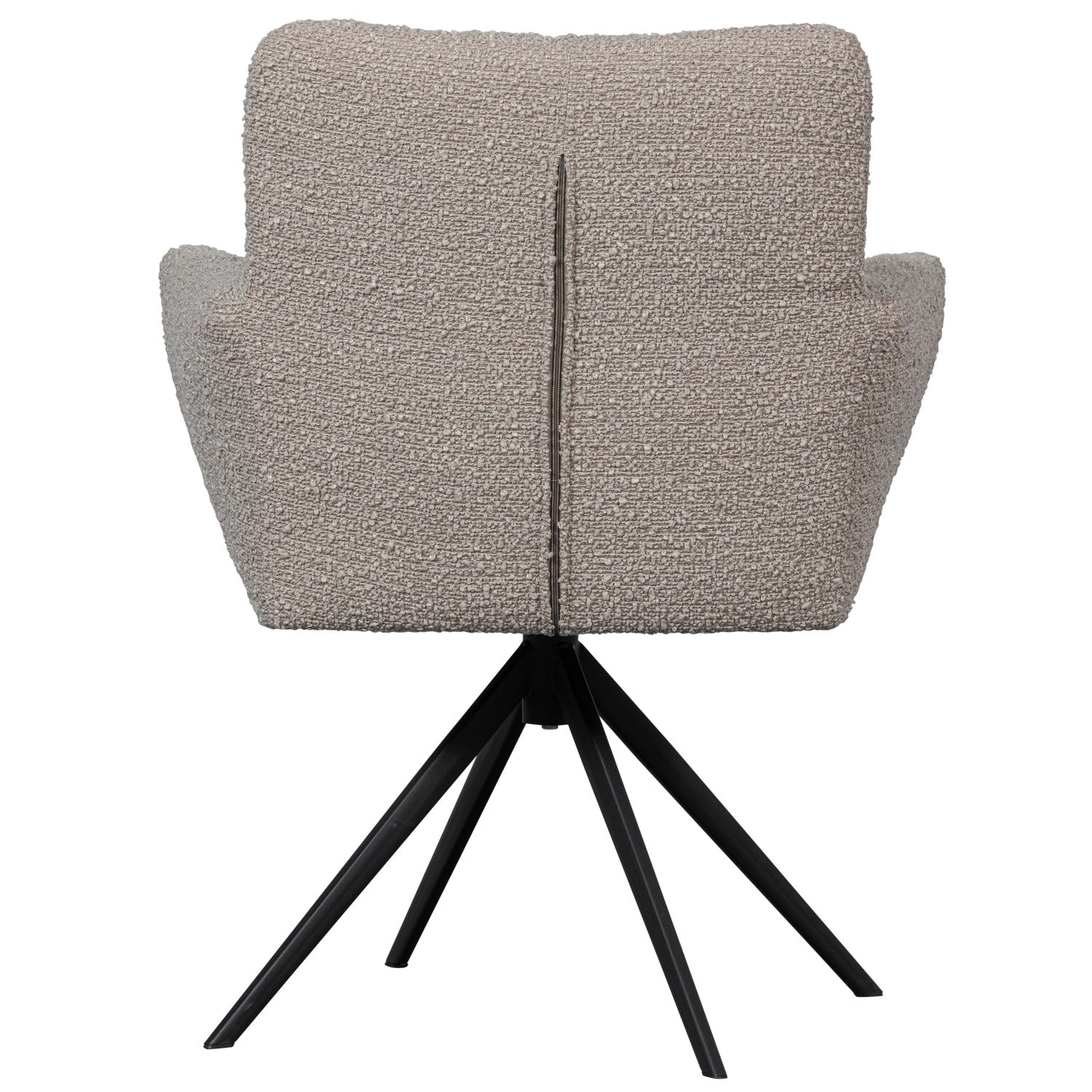 Vinny is bekleed met een superzachte bouclé stof, genaamd Cres. De samenstelling van 100% polyester maakt de stoel zeer eenvoudig in onderhoud. Het onderstel is uitgevoerd in zwart metaal met vier poten en een soepel draaisysteem. De vulling van polyurethaanschuim zorgt voor hoog zitcomfort – perfect voor eindeloos lang tafelen.