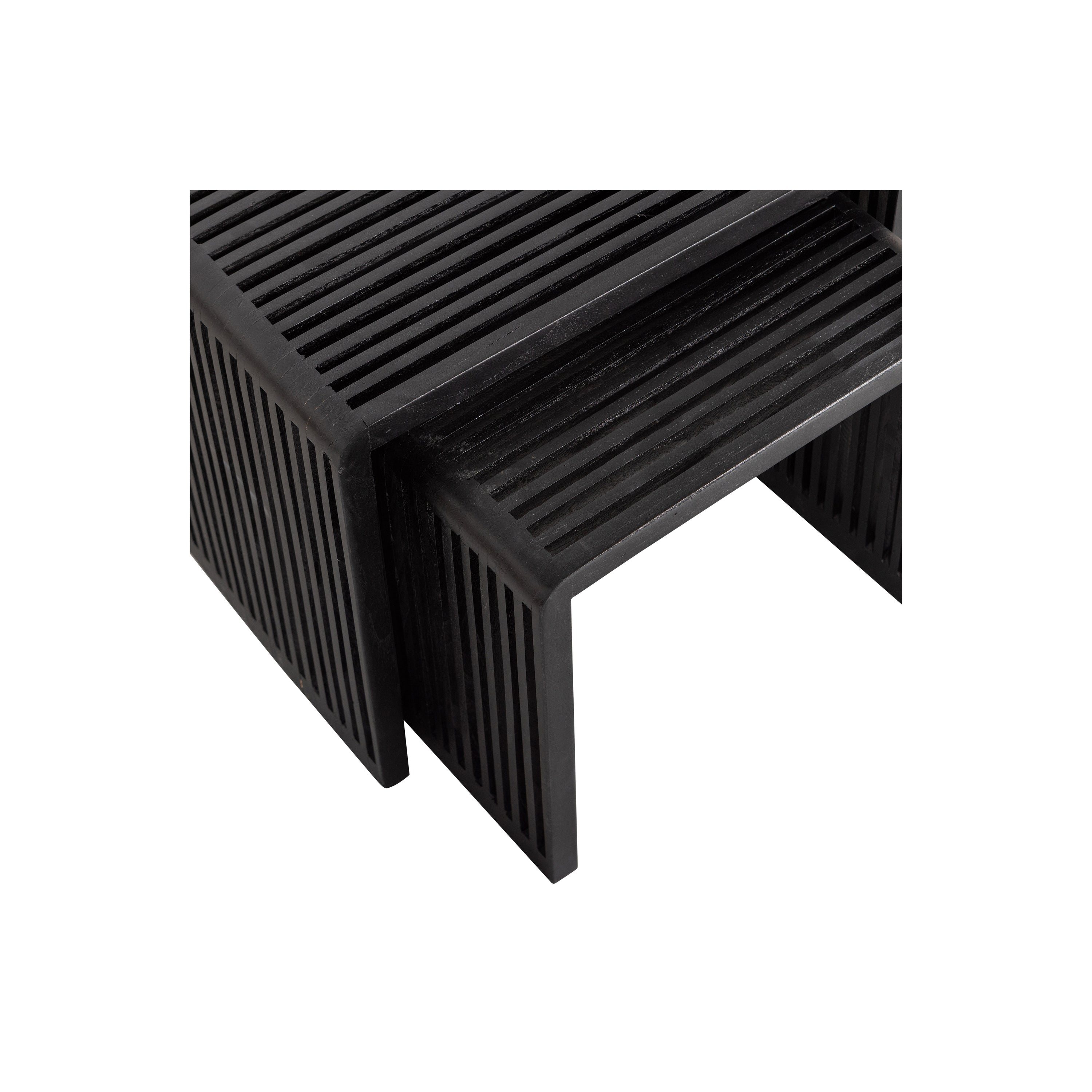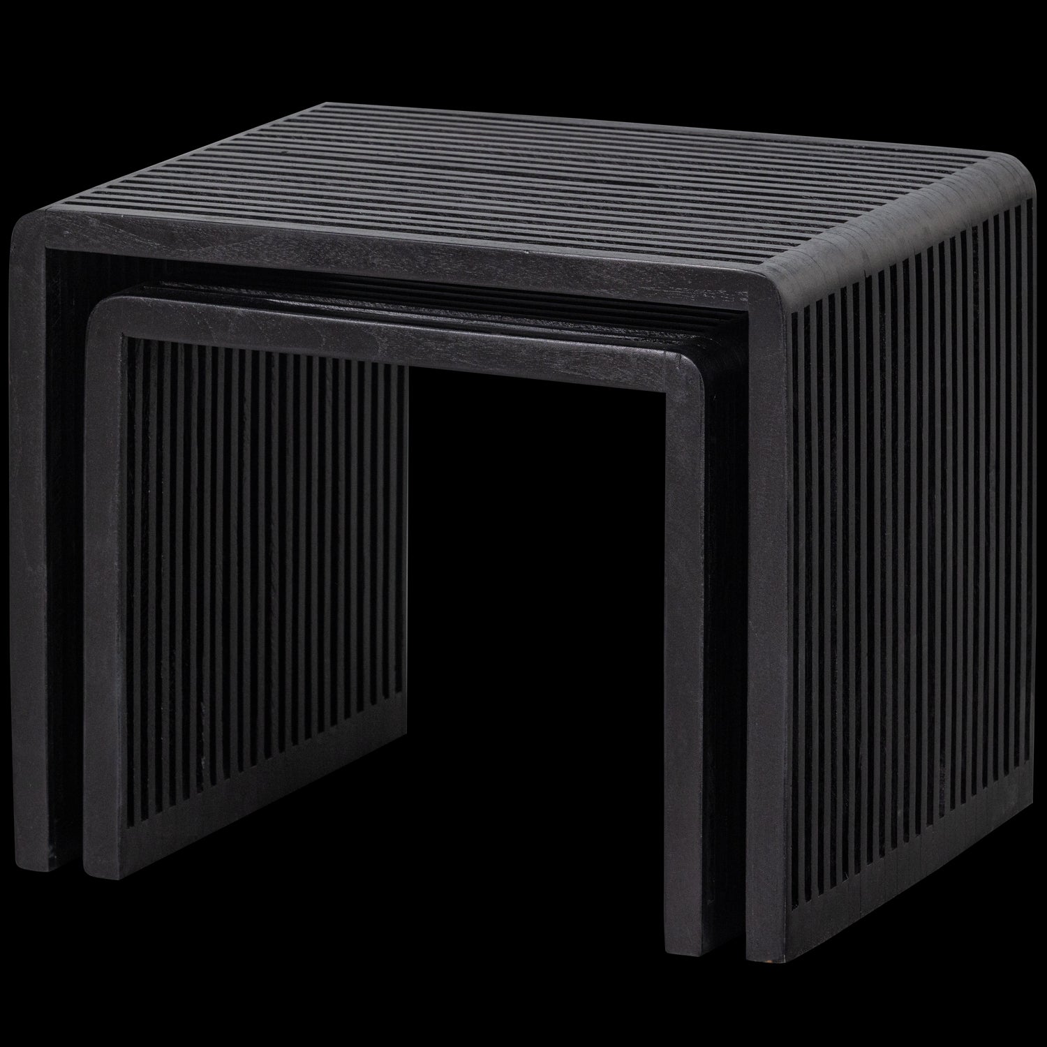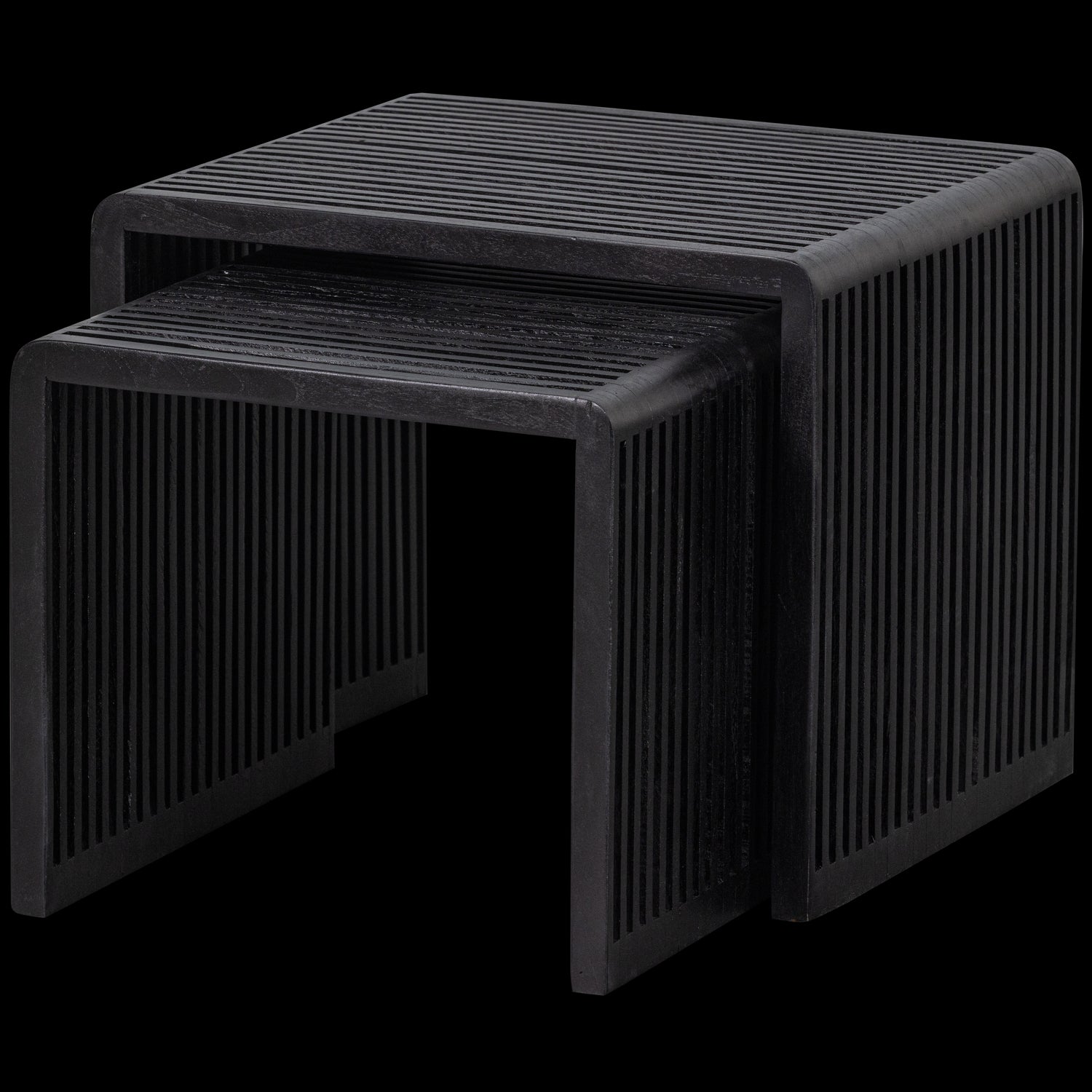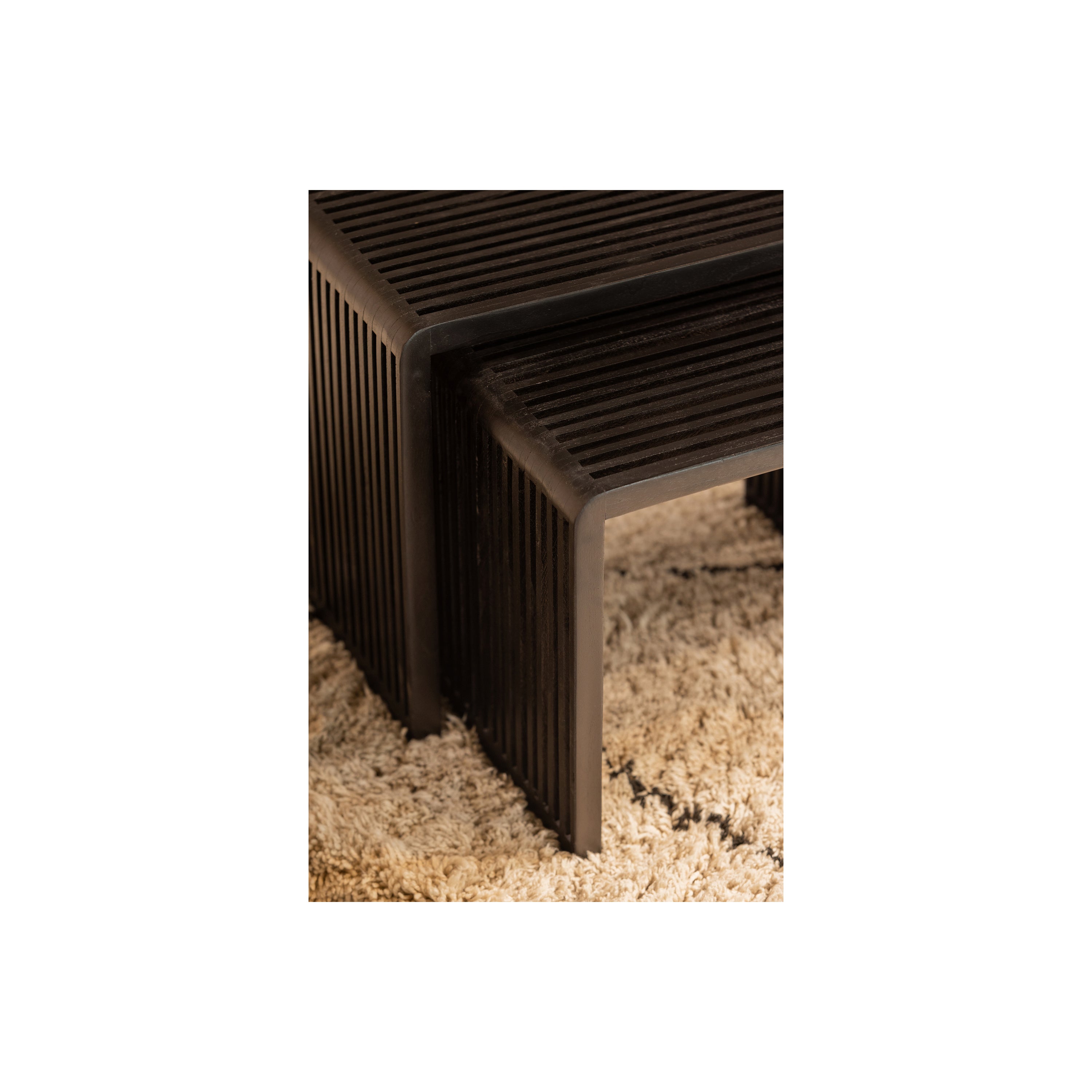 Tijdloos en eenvoudig: dat zijn de kenmerken van deze set van twee Willa bijzettafels. Deze organische set komt uit de collectie van het Nederlandse interieurmerk WOOOD en zijn vervaardigd uit een gerecycled teakhout. De matzwarte afwerking zorgt voor een rustige uitstraling, waardoor de tafels goed passen in een moderne of hotel chique woonstijl.