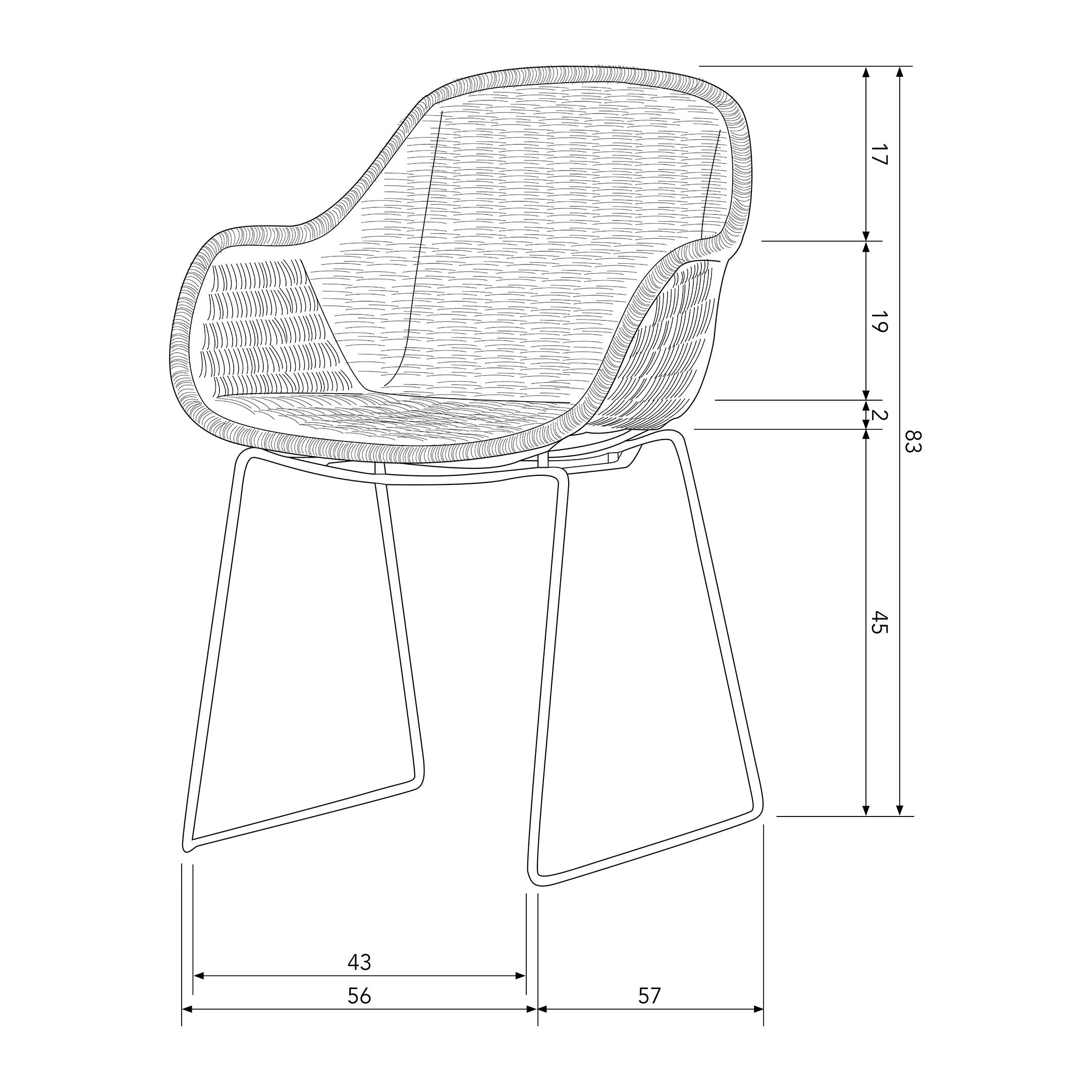 Afmetingen - Hoogte: 83 cm - Breedte: 56 cm - Diepte: 57 cm - Zithoogte: 47 cm - Zitbreedte: 38/47 cm - Zitdiepte: 41 cm - Armleuninghoogte: 19/65,5 cm - Armleuningdikte: 2 cm - Rugleuninghoogte: 37/83 cm - Rugleuningbreedte: 56 cm - Rugleuningdikte: 2 cm - Poothoogte: 45 cm - Pootdikte: ø1cm - Afstand tussen poten: 43 cm - Draaggewicht: 150 kg - Gewicht: 7,5 kg