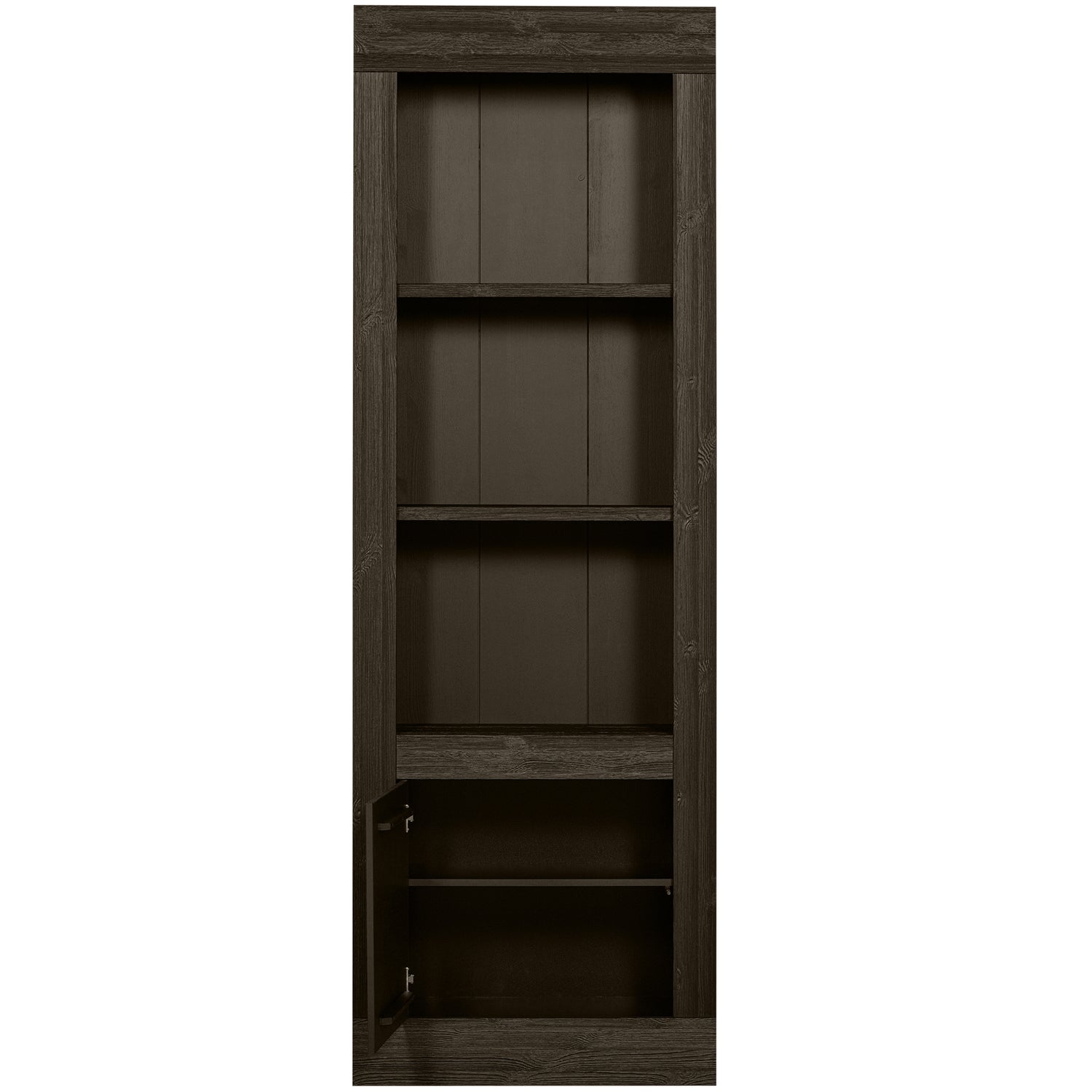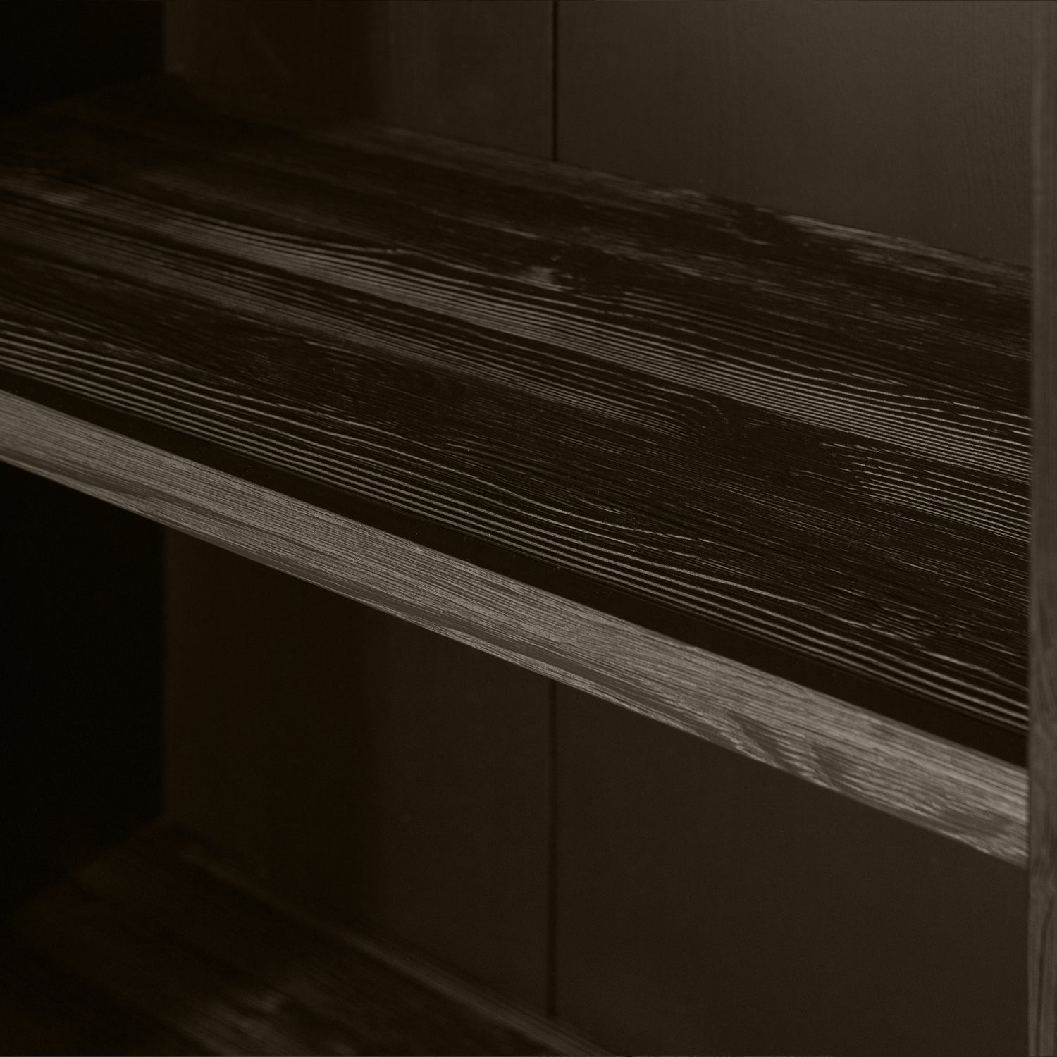 Het item is vervaardigd uit diep geborsteld grenenhout. De grenenhouten meubelen uit onze collecties zijn afkomstig van FSC-gecertificeerde leveranciers en worden op diverse manieren behandeld. Zo is geschuurd grenen zeer glad en netjes en staat geborsteld grenen juist bekend om zijn karakteristieke nerftekeningen en doorleefde uitstraling. Voor een nog robuustere look wordt het grenenhout band gezaagd. Grenenhout wordt gekenmerkt door een lichtgele kleur en zichtbare vlamtekeningen. De zwarte legplanken buiten het zicht zijn gemaakt van spaanplaat en de zwarte achterwand is gevormd uit HDF.