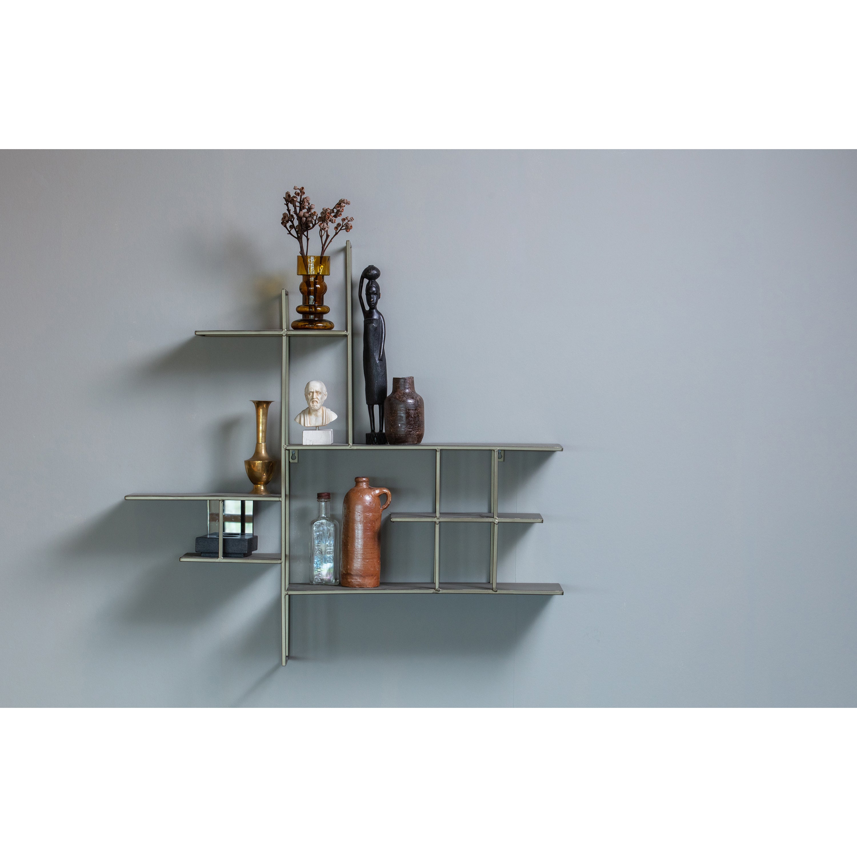 Met deze wandkast Zach uit de collectie van het Nederlandse WOOOD heb je een chique item aan de wand met een speels effect. Wandkast Zach is gemaakt van een antique grey gelakt stalen buisframe en heeft 6 legplanken in verschillende groottes, allemaal met een dikte van 1 cm. Bekijk de afmetingen van deze plankjes op de foto’s. Plaats in de wandkast je mooiste schatten en je hebt een uniek decoratie item in huis. Het max. draaggewicht per plank van boven naar onder is: 3 kg, 5kg, 3kg, 3kg, 2kg en 5kg. Zach is aan de achterzijde voorzien van drie ophangpunten om de wandkast gemakkelijk aan de wand te bevestigen. Schroeven worden niet meegeleverd.