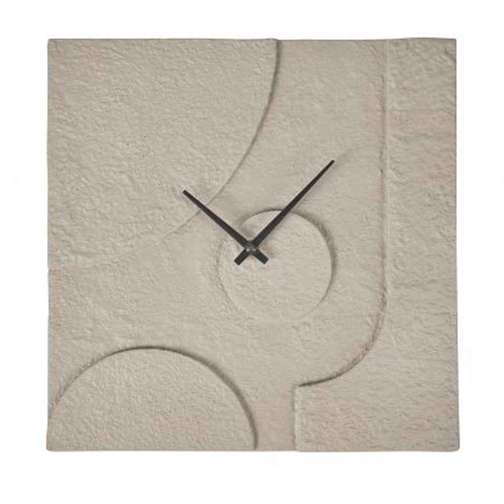 De Zaria klok, afkomstig uit de Exclusieve collectie van het Nederlandse merk WOOOD, is een schitterend decoratiestuk met een unieke vormgeving. Het organische design en de zwarte wijzers geven de klok een vleugje luxe. Of je de klok nu aan de wand hangt of op een wandplankje plaatst, Zaria voegt altijd een stijlvol accent toe aan je interieur. Materiaal De cementen items uit onze collecties worden met de hand gemaakt en gevormd in een mal. Het grove, natuurlijke materiaal zorgt ervoor dat elk item zijn eigen unieke kenmerken heeft en brengt een mooie connectie met de natuur in jouw woonruimte. Afmetingen Hoogte: 30 cm Breedte: 30 cm Diepte: 6 cm Gewicht: 2,1 kg Onderhoud Je houdt het decostuk eenvoudig stofvrij met een schone, droge doek. Vermijd het contact met water, dit kan het cement iets poreuzer maken. Plaats het decostuk buiten het bereik van kleine kinderhanden, de zware kwaliteit van het artikel kan zorgen voor ongelukken. De Zaria is eenvoudig op te hangen met behulp van een ophanggat aan de achterzijde.
