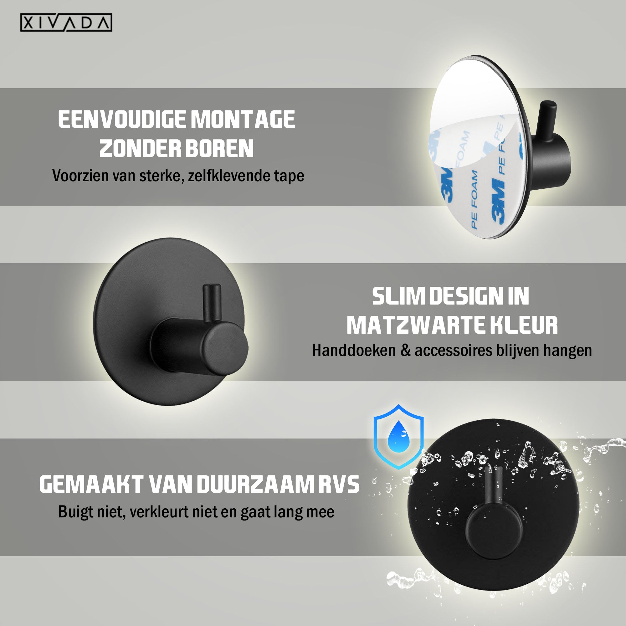 XIVADA Hannddoekhaakjes Roma - RVS - Zelfklevend - Zwart - Set van 2