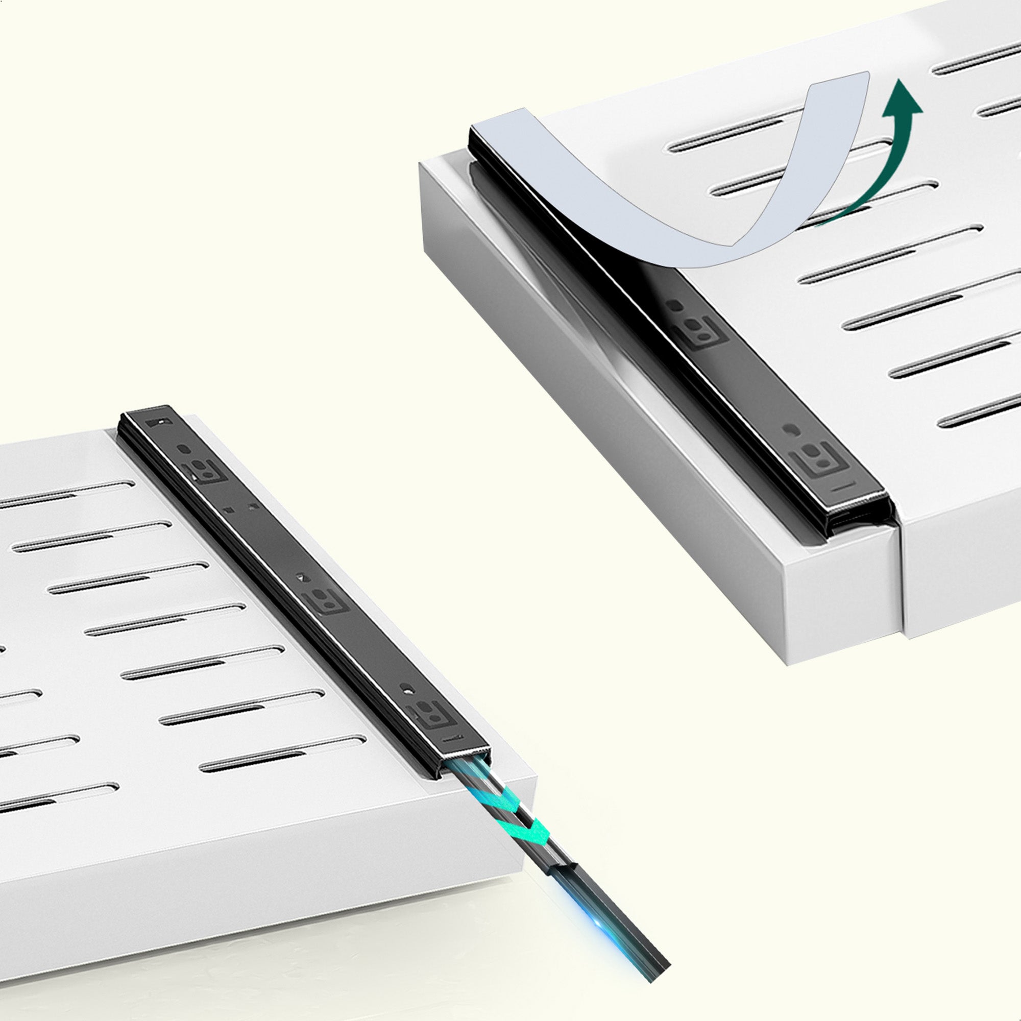 - Draai de schuiflade om en controleer de geleiderail: naar welke kant schuift deze uit? Belangrijk: als je ‘m andersom plaatst, kan de lade niet uitschuiven.