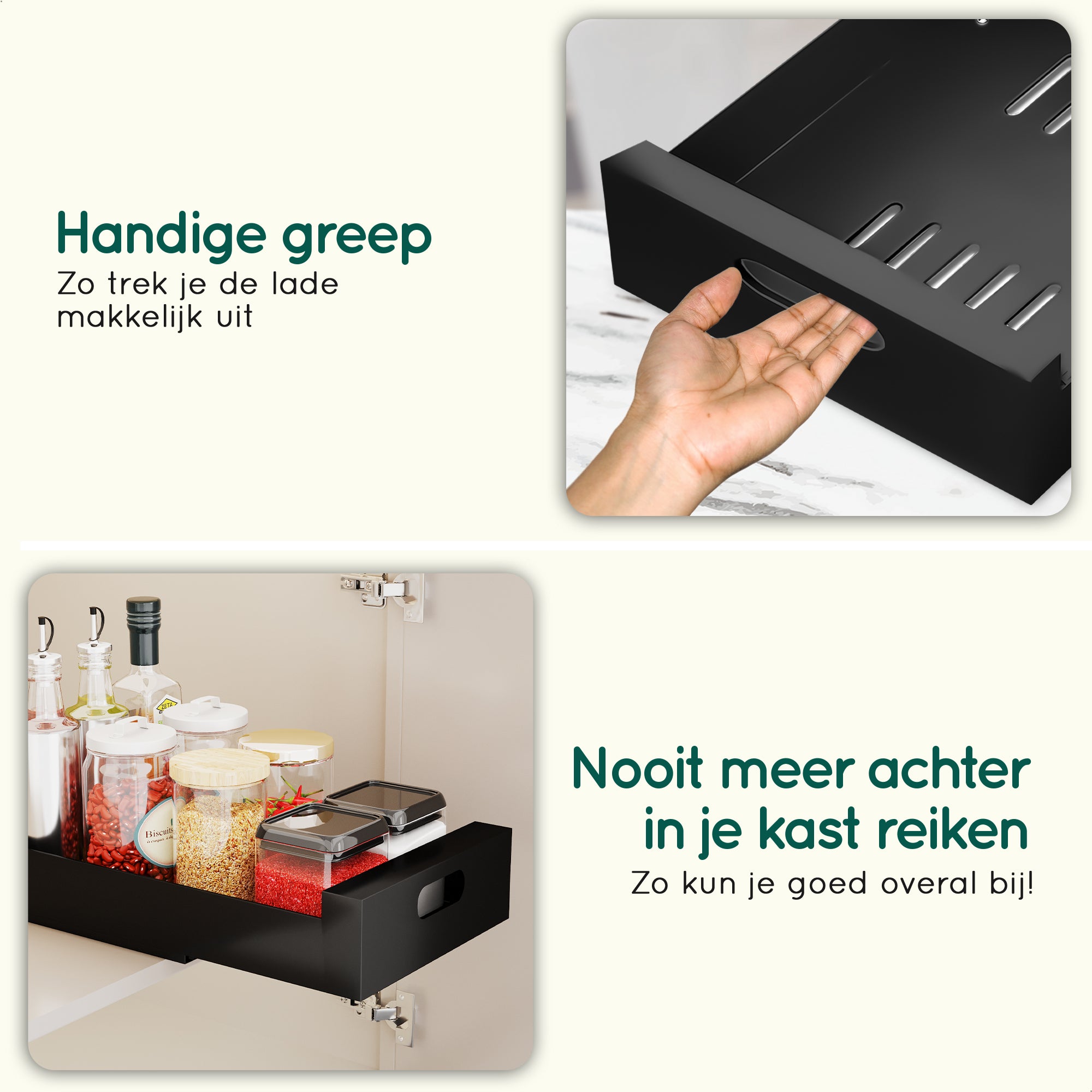 Kenmerken Uitschuifbare lade: • Materiaal: Aluminium • Kleur: Zwart (mat) • Verpakkingsinhoud: 1 stuks • Afmeting (B x H x D): 25 x 9 x 43 cm • Maximaal draaggewicht: 25 KG • Montage: zonder boren, met lijmstrip • Schroeven ook meegeleverd als je liever boort. Meer gemak en organisatie in je keuken? Bestel de lade organizers snel!