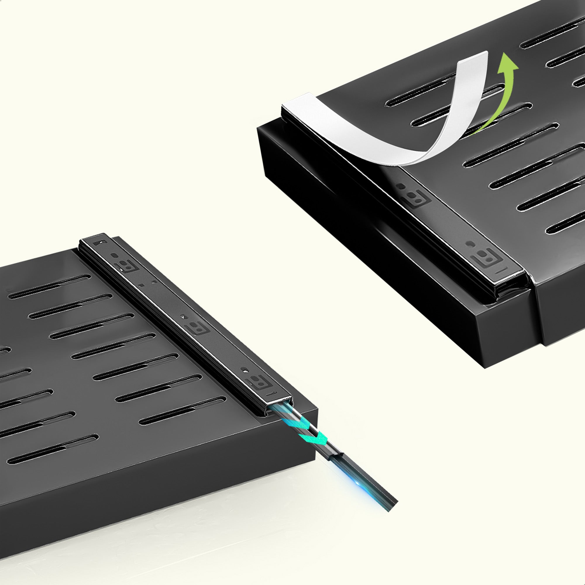 Kenmerken Uitschuifbare lade: • Materiaal: Aluminium • Kleur: Zwart (mat) • Verpakkingsinhoud: 1 stuks • Afmeting (B x H x D): 35 x 9 x 43 cm • Maximaal draaggewicht: 25 KG • Montage: zonder boren, met lijmstrip • Schroeven ook meegeleverd als je liever boort. Meer gemak en organisatie in je keuken? Bestel de lade organizers snel!