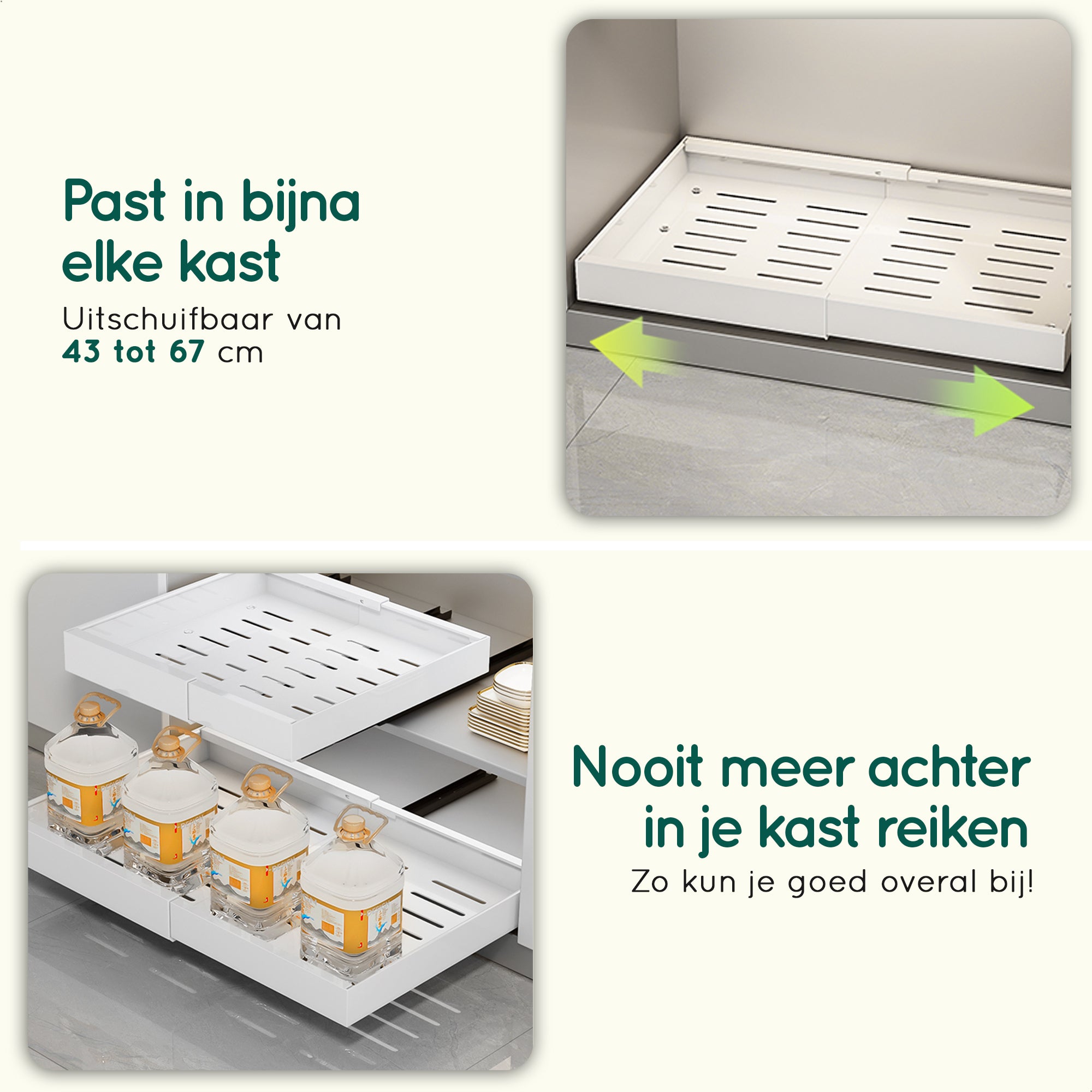 Nooit snel bij je voorraad kunnen of altijd aan het zoeken in een rommelige keukenkast? Maak het jezelf gemakkelijker met een keukenkast organizer ladesysteem. Perfect voor de gootsteenkast of keukenkastjes. Zo staan al je keukenspullen netjes op hun plek én schuif je ze makkelijk naar voren. Voordelen ✓ Montage zonder boren ✓ Beter gebruik van kastruimte ✓ Gemakkelijker spullen pakken ✓ Gemaakt van sterk staal Makkelijk op maat maken Doordat de lade organizer verstelbaar is, past hij in vrijwel elke kast. Je kunt het formaat verstellen in elke maat tussen 43 en 67 cm. Robuust en stabiel De schuiflade bestaat uit een frame van sterk aluminium met stalen geleiders. De nanotape is krachtig zodat hij jarenlang blijft zitten. Het systeem draagt makkelijk 25 KG zoals zware pannen, servies, voedingsmiddelen, schoonmaakspullen of keukenapparaten.