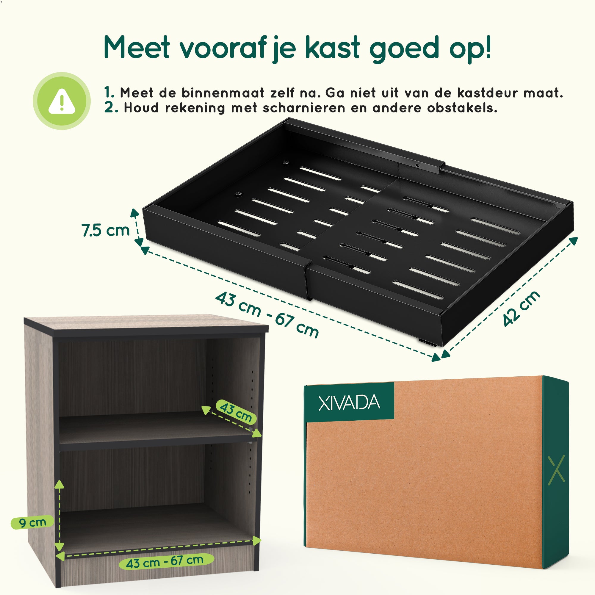 Nooit snel bij je voorraad kunnen of altijd aan het zoeken in een rommelige keukenkast? Maak het jezelf gemakkelijker met een keukenkast organizer ladesysteem. Perfect voor de gootsteenkast of keukenkastjes. Zo staan al je keukenspullen netjes op hun plek én schuif je ze makkelijk naar voren. Voordelen ✓ Montage zonder boren ✓ Beter gebruik van kastruimte ✓ Gemakkelijker spullen pakken ✓ Gemaakt van sterk staal Makkelijk op maat maken Doordat de lade organizer verstelbaar is, past hij in vrijwel elke kast. Je kunt het formaat verstellen in elke maat tussen 43 en 67 cm. Robuust en stabiel De schuiflade bestaat uit een frame van sterk aluminium met stalen geleiders. De nanotape is krachtig zodat hij jarenlang blijft zitten. Het systeem draagt makkelijk 25 KG zoals zware pannen, servies, voedingsmiddelen, schoonmaakspullen of keukenapparaten.