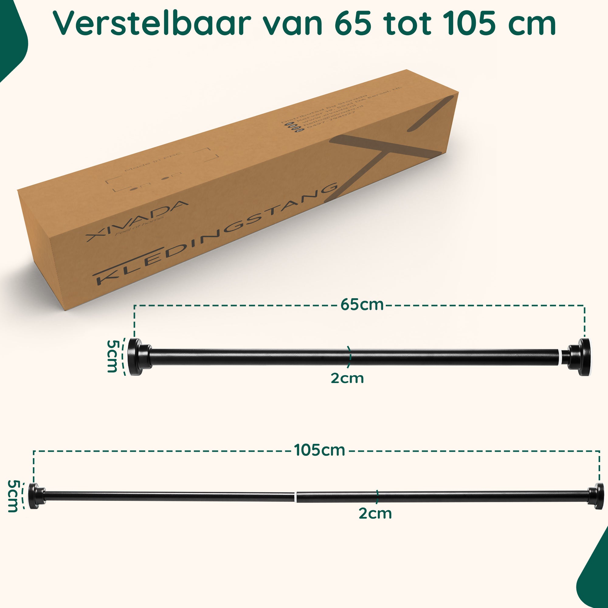 De verstelbare kledingstang pas je eenvoudig aan naar het juiste formaat. Zo past de stang in de meeste kledingkasten. Het product is geschikt als je kast tussen de 65 en 105 cm breed is. Is je kast groter of kleiner? Dan past het product niet.