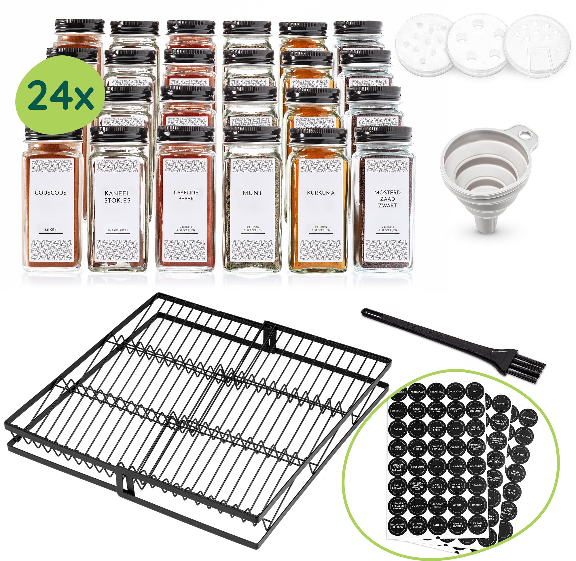 ► Kruidenrek van metaal; ► 240x kruidenlabels; ► 48x kruidenstrooiers; ► 24x Glazen potjes met zwarte deksel ► Schoonmaakborstel ► Siliconen trechter
