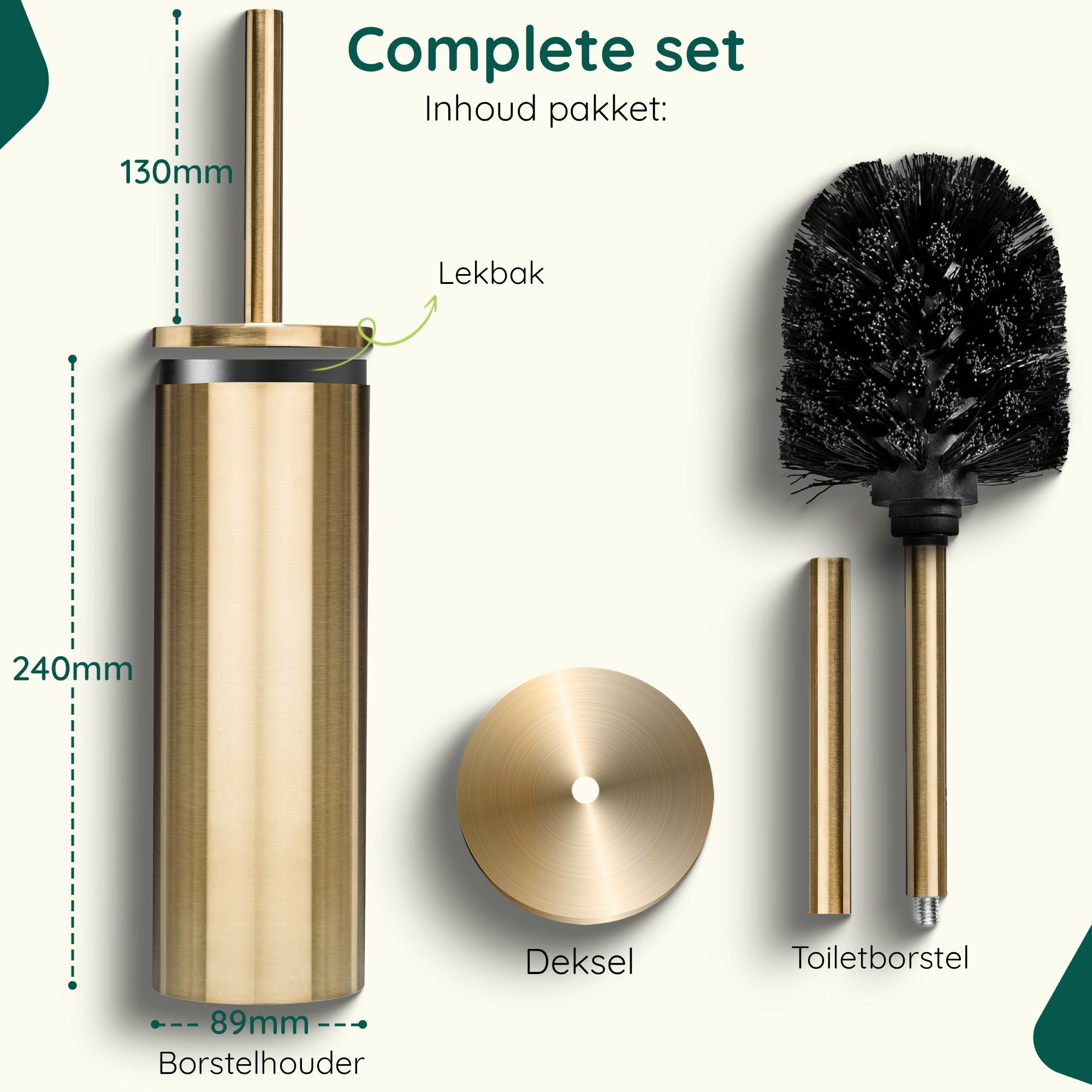 Voordelen: ✓ Complete set: wc borstel, houder en lekbak ✓ Stijlvolle gouden kleur ✓ Vrijstaand design - dus boren niet nodig ✓ Kwalitatief Rvs materiaal