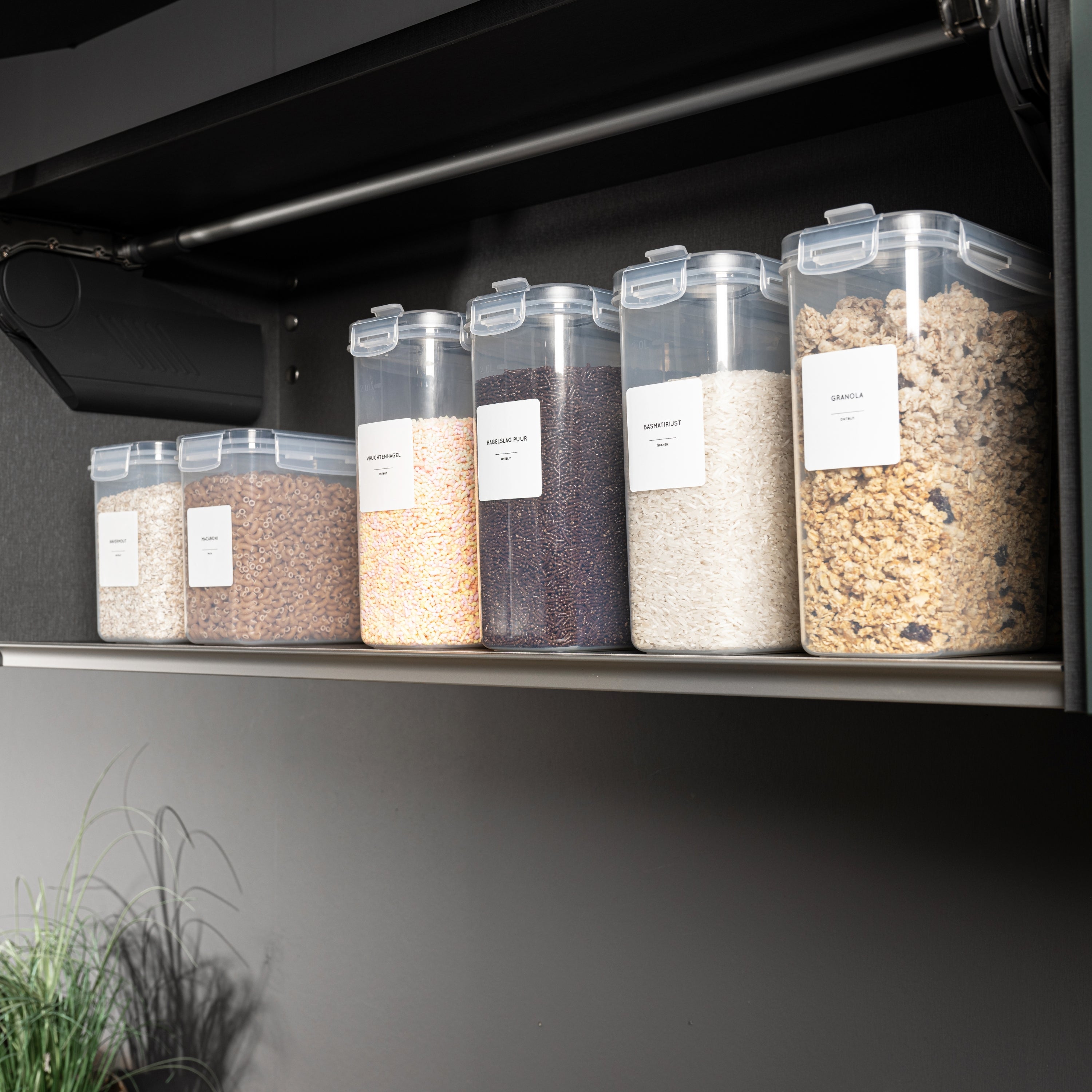 Door voorraadbussen te gebruiken, ziet de keukenkast er een stuk netter uit dan dat je alles in losse verpakkingen in de kast gooit. Het helpt je om overzichtelijk voedsel te bewaren en organiseren. En ruimte te besparen: een doos ontbijtgranen bestaat voor 30% uit lucht.