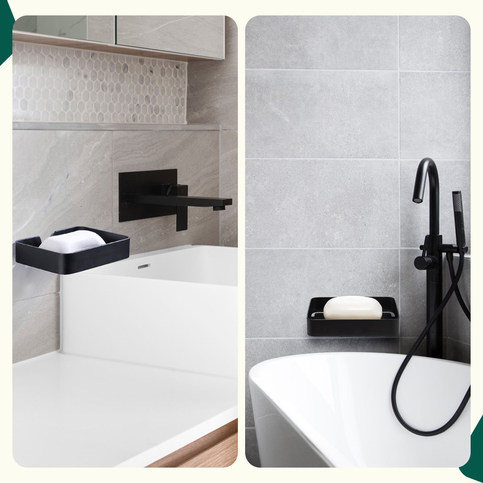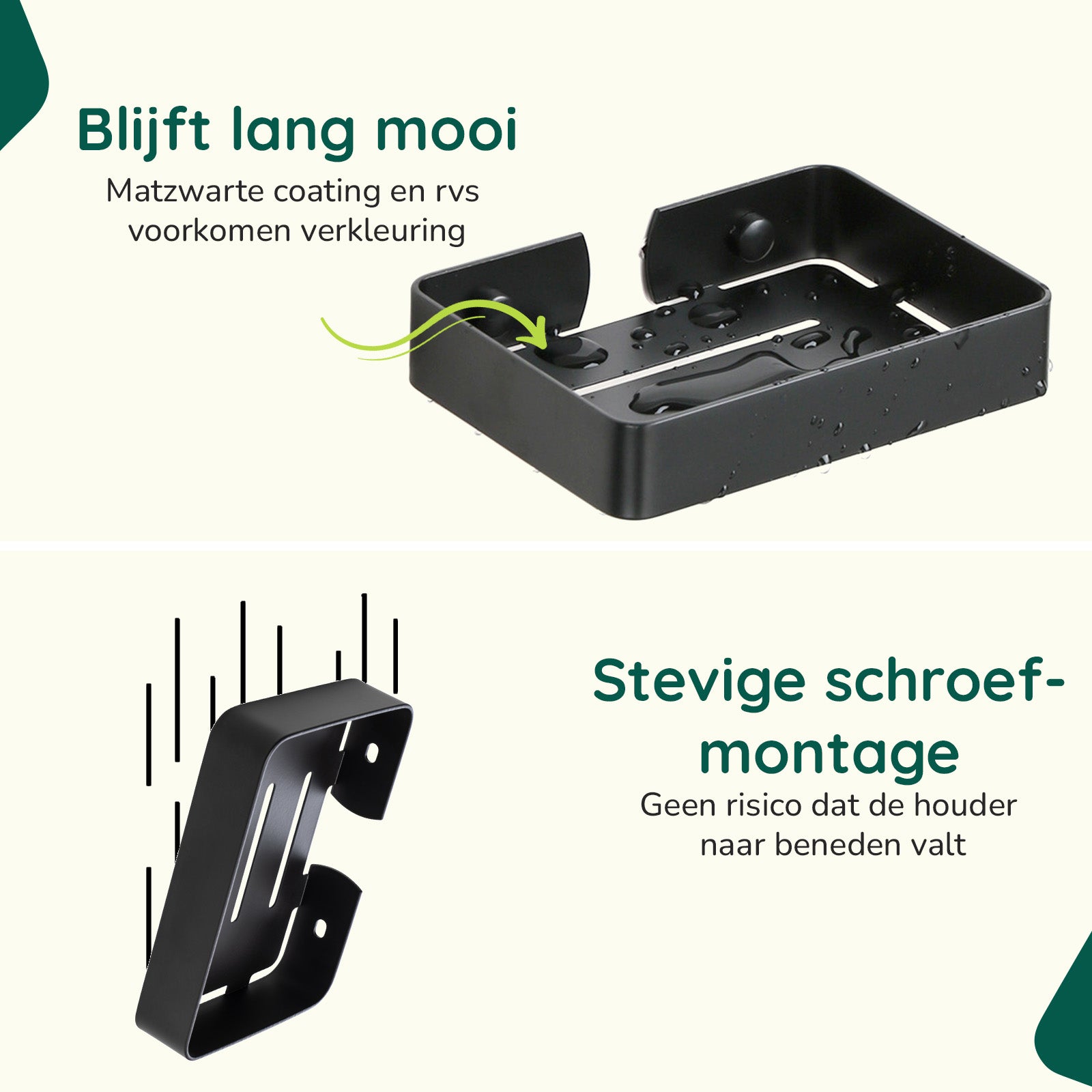 Matzwart zeepbakje met luxe design Een plek om je zeep op te bergen zonder afbreuk te doen aan je mooie badkamer? De zeephouder zorgt voor een vaste plek voor je zeep zodat je badkamer netjes blijft. Door zijn kleine formaat (10 x 13.5 cm) neemt hij nauwelijks ruimte in. Het design is minimalistisch en matzwart. Goede match voor de meeste badkamers dus!