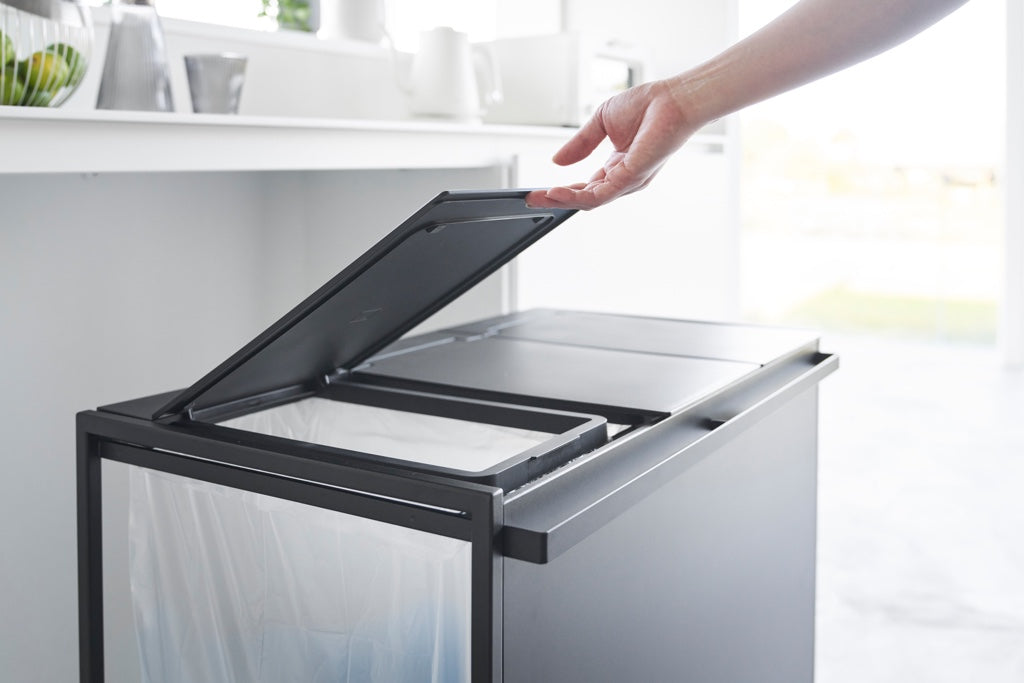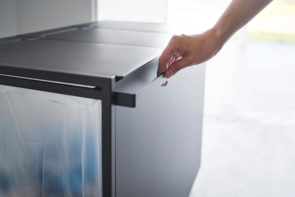 Deze prullenbak van Yamazaki heeft drie compartimenten waarin je boodschappen- of vuilniszakken kunt hangen. Dankzij de praktische wieltjes en handgreep verplaats je de prullenbak moeiteloos naar iedere gewenste plek. De deksel biedt niet alleen een discrete afsluiting, maar is ook gemakkelijk te openen en blijft dankzij een siliconenstopper op zijn plek staan, handig tijdens het vervangen van de zakken. Daarnaast biedt de onderste plank extra opbergruimte voor je voorraad vuilniszakken of andere benodigdheden.