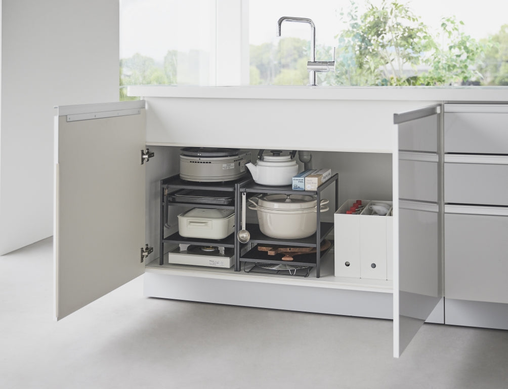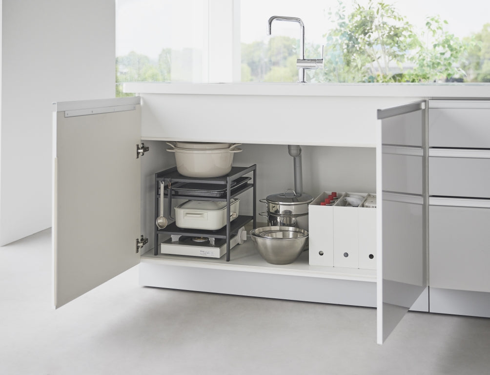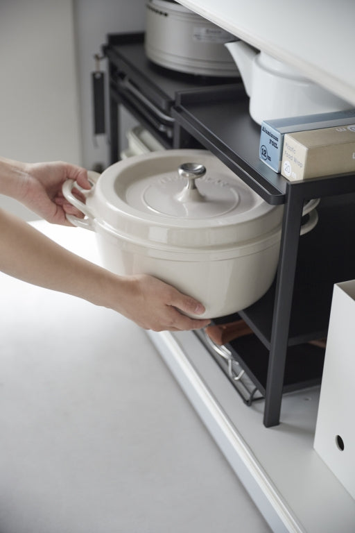 Dit opbergrek van Yamazaki is een handige en effectieve manier om kasten te organiseren. Het biedt flexibele opslagmogelijkheden op 3 niveaus, met twee planken die in hoogte verstelbaar zijn om aan verschillende organisatorische behoeften te voldoen.