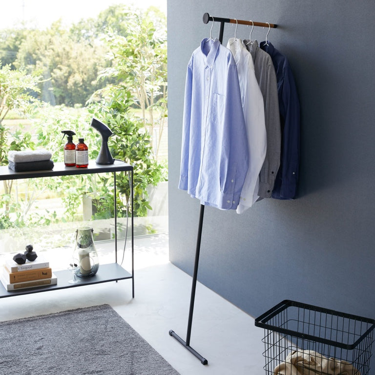Dit rek van Yamazaki biedt voldoende ruimte voor het ophangen van jassen en andere kledingstukken. Na het ophangen kunnen de kledingstukken eenvoudig gestoomd worden om kreukels te verwijderen. Het rek leunt tegen de muur en vereist geen vaste installatie, waardoor het gemakkelijk te plaatsen is.