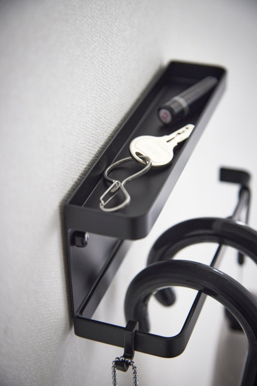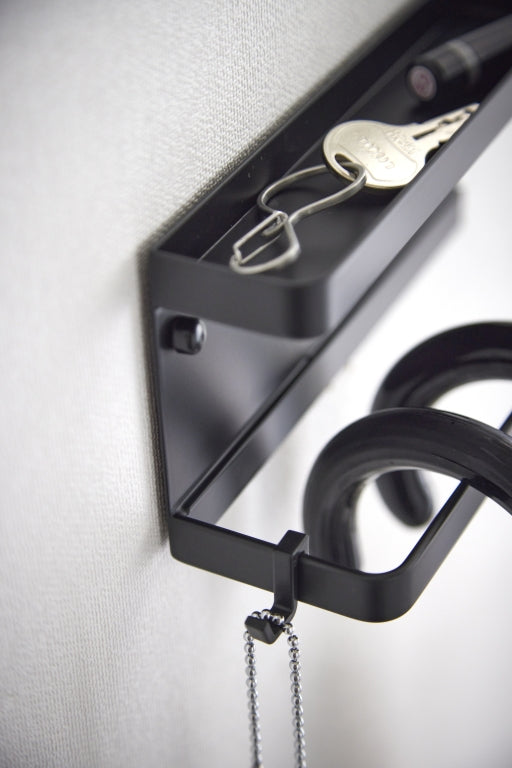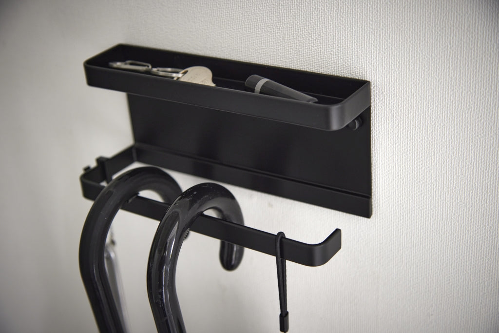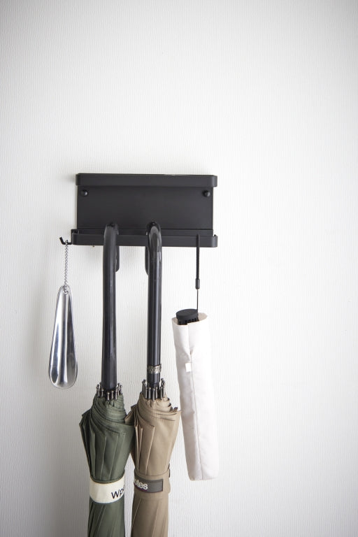 Deze parapluhouder van Yamazaki kun je aan de muur bevestigen zodat je geen kostbare vloerruimte hoeft in te leveren. voor je entree blijft alles netjes georganiseerd en klaar voor gebruik, en dat in een handomdraai. Paraplu's kunnen nu met gemak worden opgehangen en zullen nooit meer in de weg staan. En hoewel het is ontworpen als minimalistisch en compact, heeft het nog steeds een handig bakje voor al die essentiële spullen die je snel wilt pakken voordat je vertrekt. Van kleingeld tot je favoriete lippenstift en je sleutels, alles heeft een plekje op deze het plankje. Naast paraplu’s kun je ook petten, tassen en sjaals ophangen aan de stang. Of gebruik de meegeleverde haken om bijvoorbeeld schoenlepels of andere kleine items aan te hangen. Deze handige houder kan worden bevestigd op gipsplaten en dunne fineerwanden, waaronder behang, stofbehang en vinylbehang. Gipsnagels zijn geschikt voor muren met een dikte van 9,5 mm of meer, en dunne fineerwanden met een dikte van 5 mm of meer. Het is echter niet geschikt voor gebruik op gips geluidsabsorberende platen of steenwol geluidsabsorberende platen. Ook wordt het afgeraden om het te gebruiken op broze muren zoals pleister of mortel, dunne boardwanden van 4 mm of minder, harde muren zoals staal, beton of baksteen, tegels en tegelvoegen. Het is belangrijk om de houder niet te installeren op locaties waar interferentie is met de basis, zoals kolommen, balken, stijlen of bedrading. Als je het op nieuwe houten bouwmaterialen zoals fineer wilt installeren, zorg er dan voor dat je een hamer bij de hand hebt. Zorg er bij het installeren voor dat je de aanbevelingen voor wanddikte en materiaalsoorten volgt, zodat de houder stevig en veilig aan de muur kan worden bevestigd. Met de juiste voorbereiding en gereedschappen kun je deze houder op een handige plek in je huis installeren en genieten van de extra opbergmogelijkheden die het biedt.