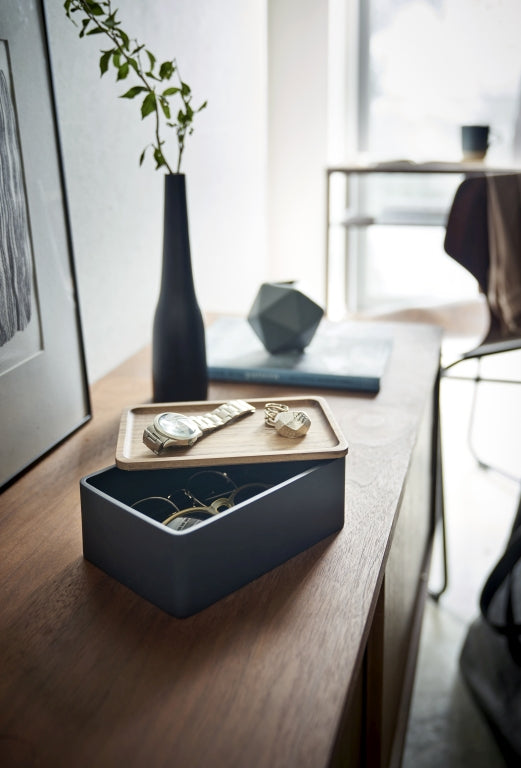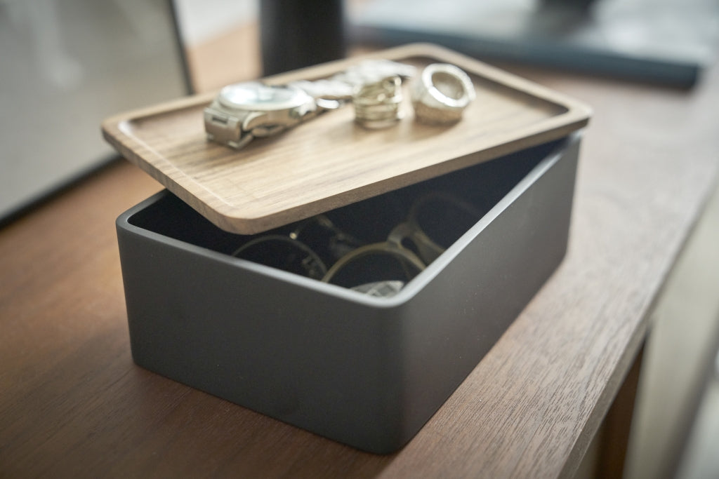 De sieraden opbergdoos van Yamazaki is met elegantie en verfijning in gedachten vervaardigd en voegt niet alleen een vleugje warmte en elegantie toe aan je kaptafel, maar brengt ook broodnodige organisatie in je collectie sieraden en accessoires. Geen zoektocht meer naar je favoriete ketting of oorbellen - alles heeft nu een gezellig en permanent thuis in deze mooie doos, waardoor ze gemakkelijk te vinden zijn wanneer dat nodig is. Het prachtige houten deksel voegt niet alleen verfijning toe aan het ontwerp, maar zorgt er ook voor dat je items stofvrij blijven. De slimme uitsparing biedt zelfs nog meer opslagruimte, perfect om je meest gebruikte en favoriete items altijd binnen handbereik te houden.