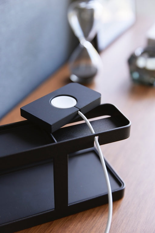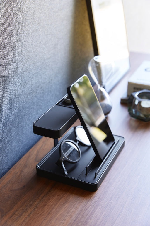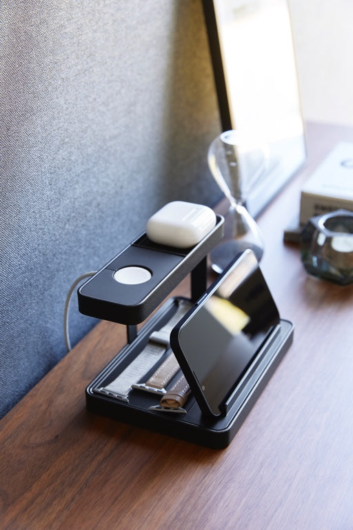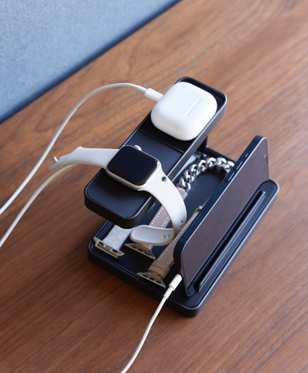 Met deze handige standaard van Yamazaki kun je apparaten zowel opladen als opbergen. De bovenkant van de standaard is voorzien van een kabelgleuf en een siliconenpad speciaal voor smartwatches, terwijl het onderste gedeelte een houder biedt voor tablets en telefoons.