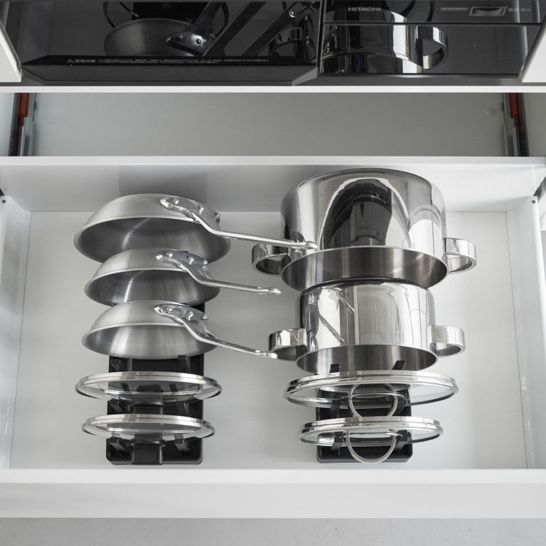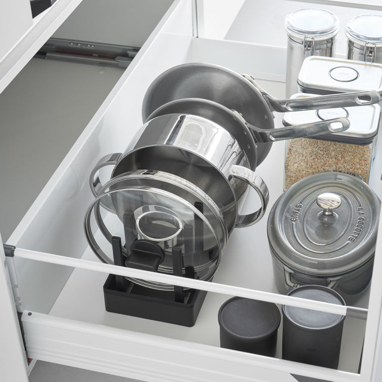 Dit rekje van Yamazaki is ideaal voor het overzichtelijk opbergen van potten, pannen en deksels naast elkaar. Het zorgt voor een nette en georganiseerde keukenlade, waarin pannen en deksels eenvoudig kunnen worden gepakt.