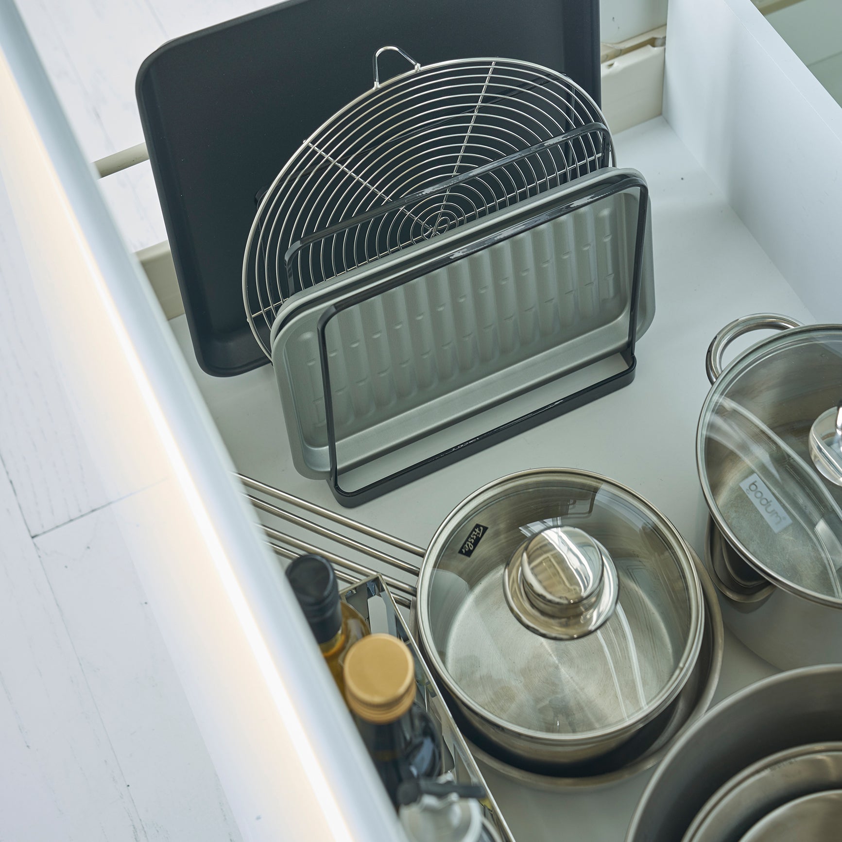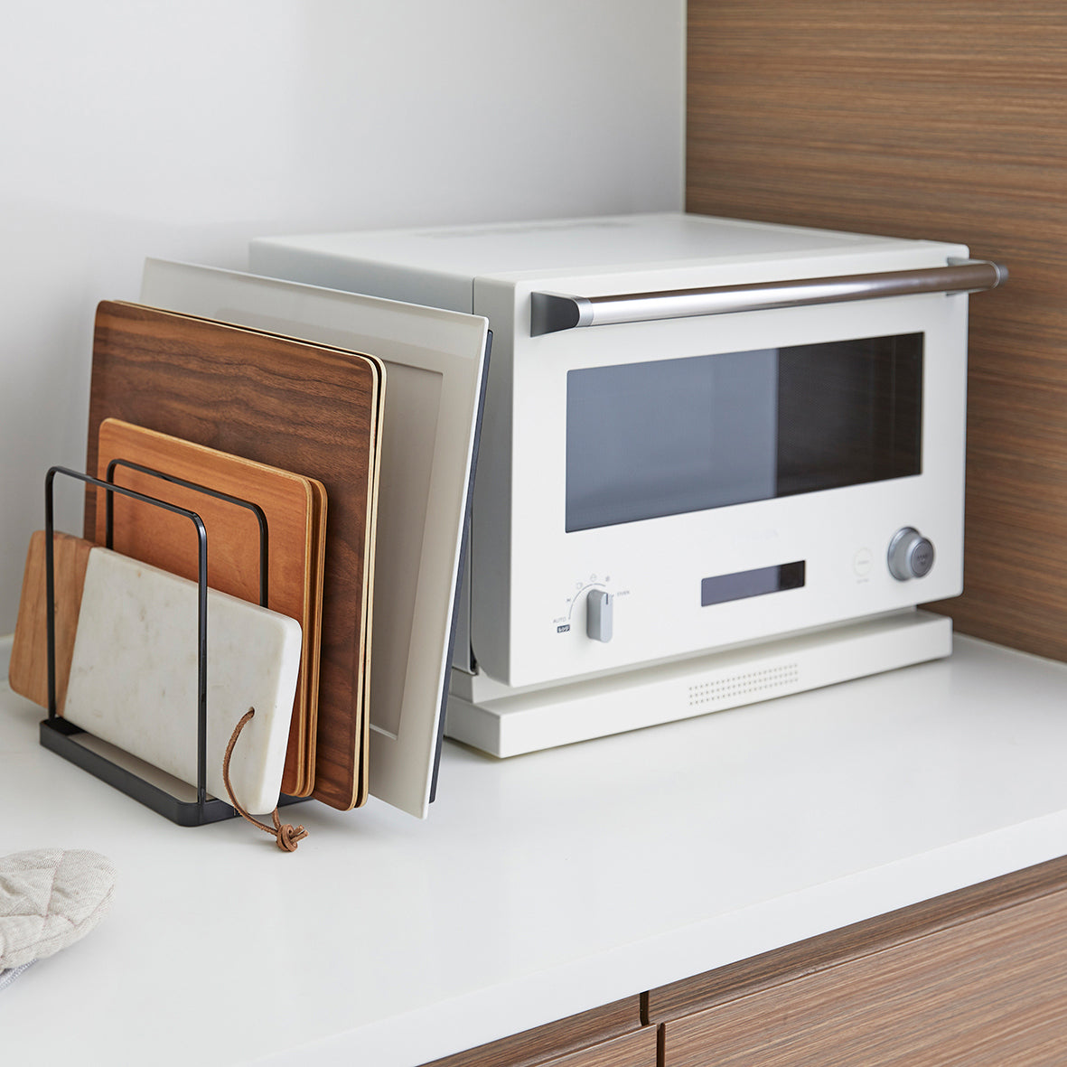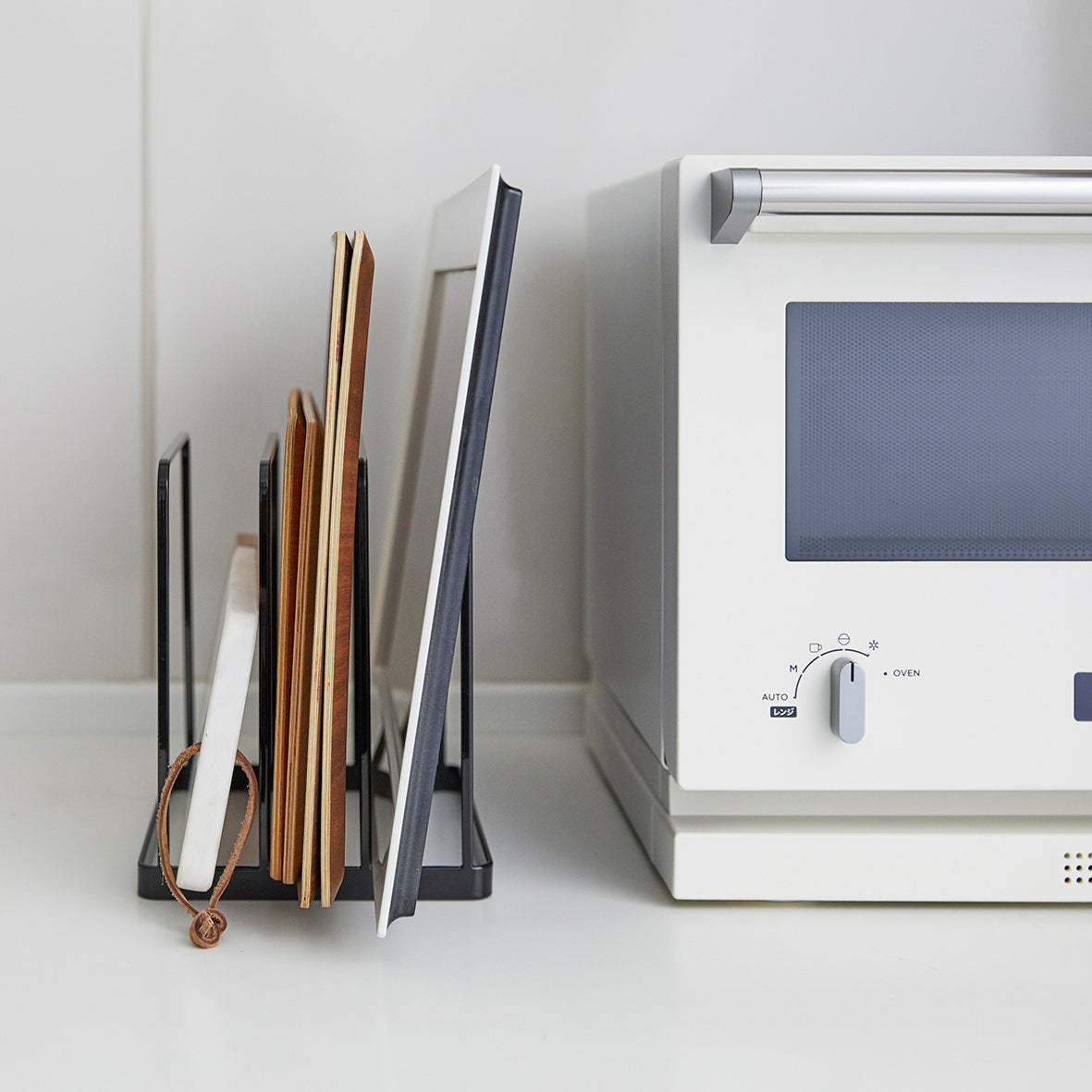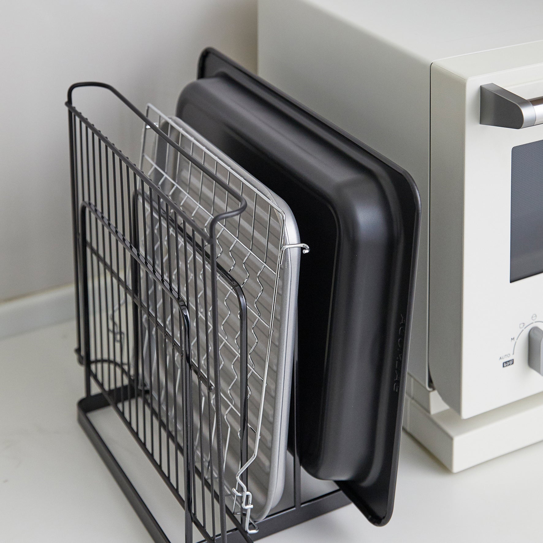 Waar laat jij alle rommel op het aanrecht? Met deze Towel dienbladen standaard van Yamazaki berg je verschillende soorten dunne keukengerei zoals dienbladen, snijplanken of ovenroosters netjes op. Zet hem op je aanrecht of berg hem op in een kastje.