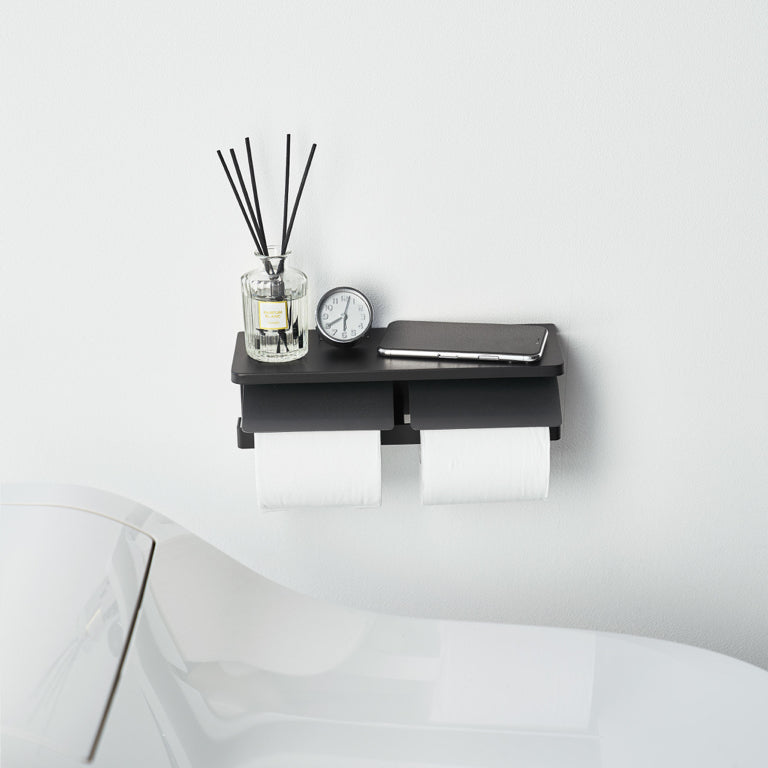 Deze dubbele toiletpapierhouder van Yamazaki biedt ruimte voor twee toiletrollen tegelijk. Dankzij het handige zijlaadsysteem is de rol eenvoudig te vervangen. Daarnaast is de houder gemakkelijk aan de muur te monteren met de meegeleverde pinnen en schroeven. Het bovenste plankje is perfect om kleine badkamerbenodigdheden, decoratie of zelfs je telefoon op te leggen.