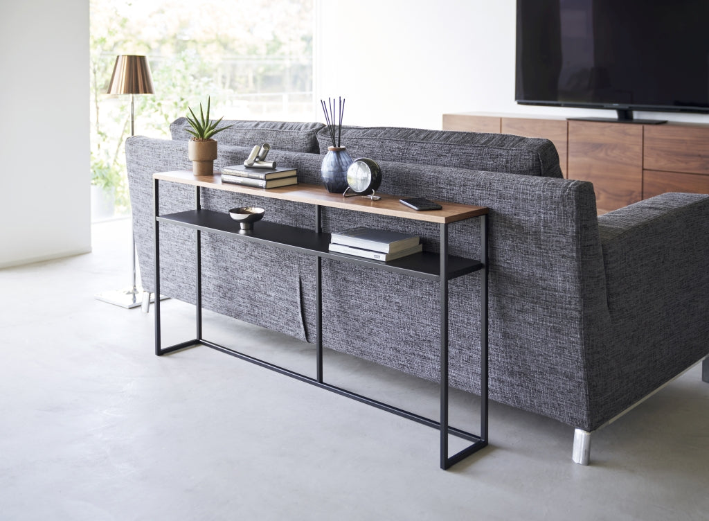 Deze console tafel van Yamazaki is een perfecte combinatie van elegantie en functionaliteit, met een prachtig houten bovenblad en een verlengde structuur. Hij is ideaal voor het tentoonstellen van decoraties en het binnen handbereik houden van essentiële items, waardoor het een geweldige toevoeging is achter een bank voor extra opbergruimte. De slanke vorm maakt het ook mogelijk om de tafel in deuropeningen en gangen te plaatsen. Het strakke ontwerp met houten accenten voegt een vleugje stijl toe aan elke ruimte. Met extra plankruimte biedt deze tafel voldoende ruimte voor sleutels, decoraties en accessoires. Het bovenblad heeft een draagvermogen van 5 kg, terwijl de plank tot 4 kg kan dragen.