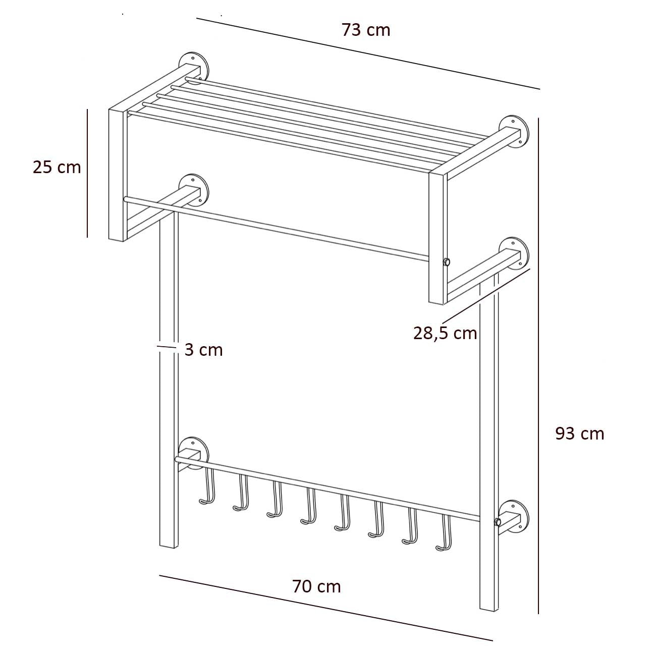 De totale breedte van dit artikel is 73 cm, de hoogte is 93 cm en de kapstok komt 28,5 cm van de muur af. Dit is een "bouwpakket" en de kapstok is simpel te monteren, deze kapstok wordt geleverd excl. kleding hangers.