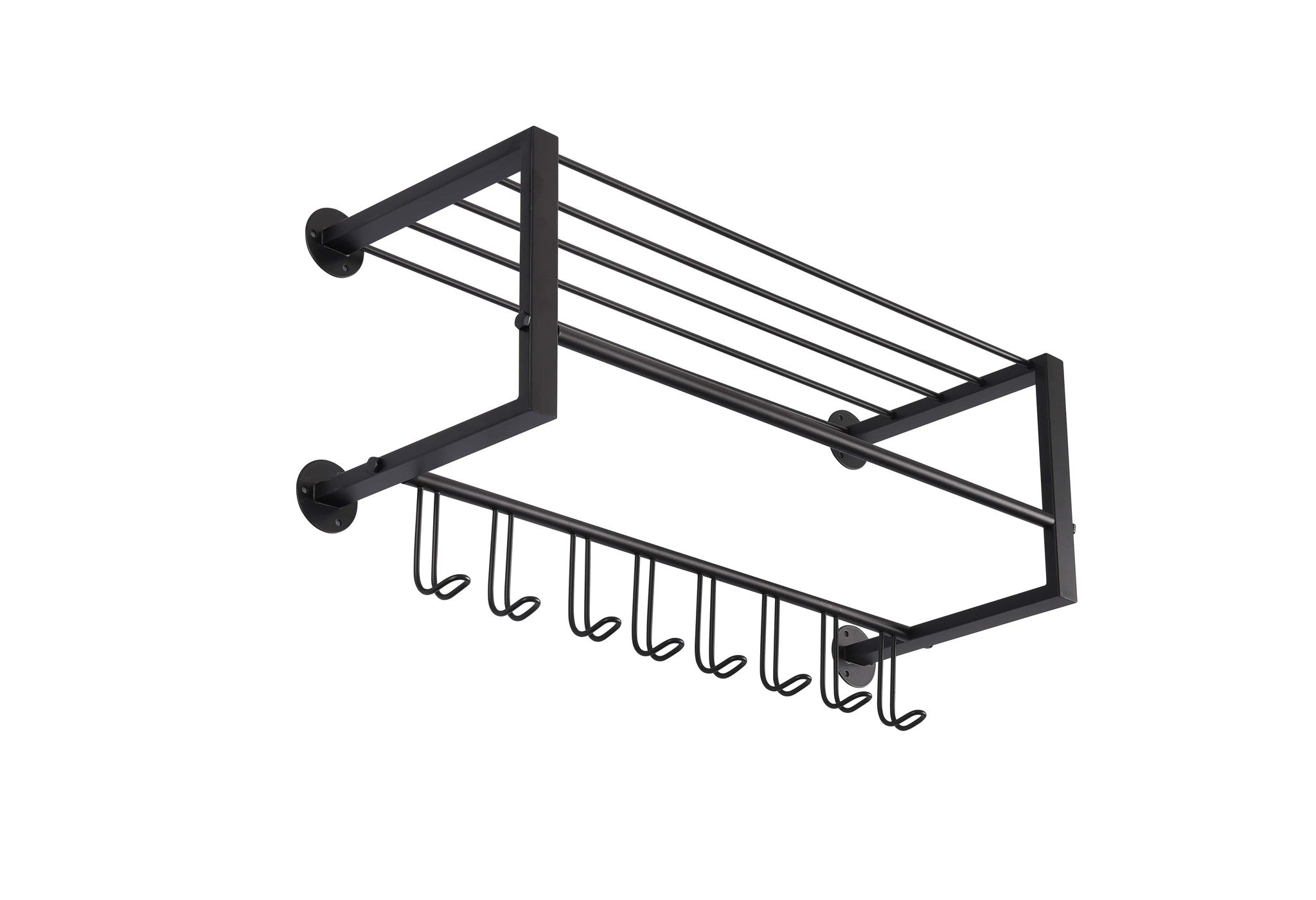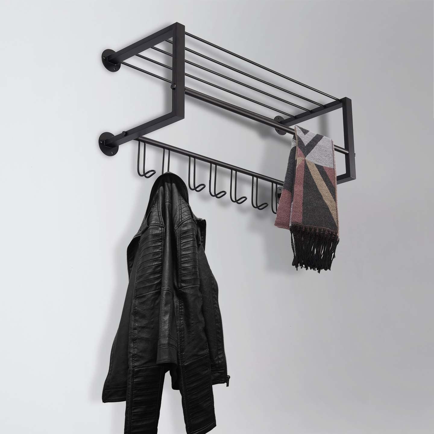 Functionele kapstok gemaakt van rechthoekige en ronde buizen en die is voorzien van 8 haken. Tevens is deze kapstok voorzien van een roede voor kleding hangers en een legplank om kledingstukken (of accessoires) op te leggen.
