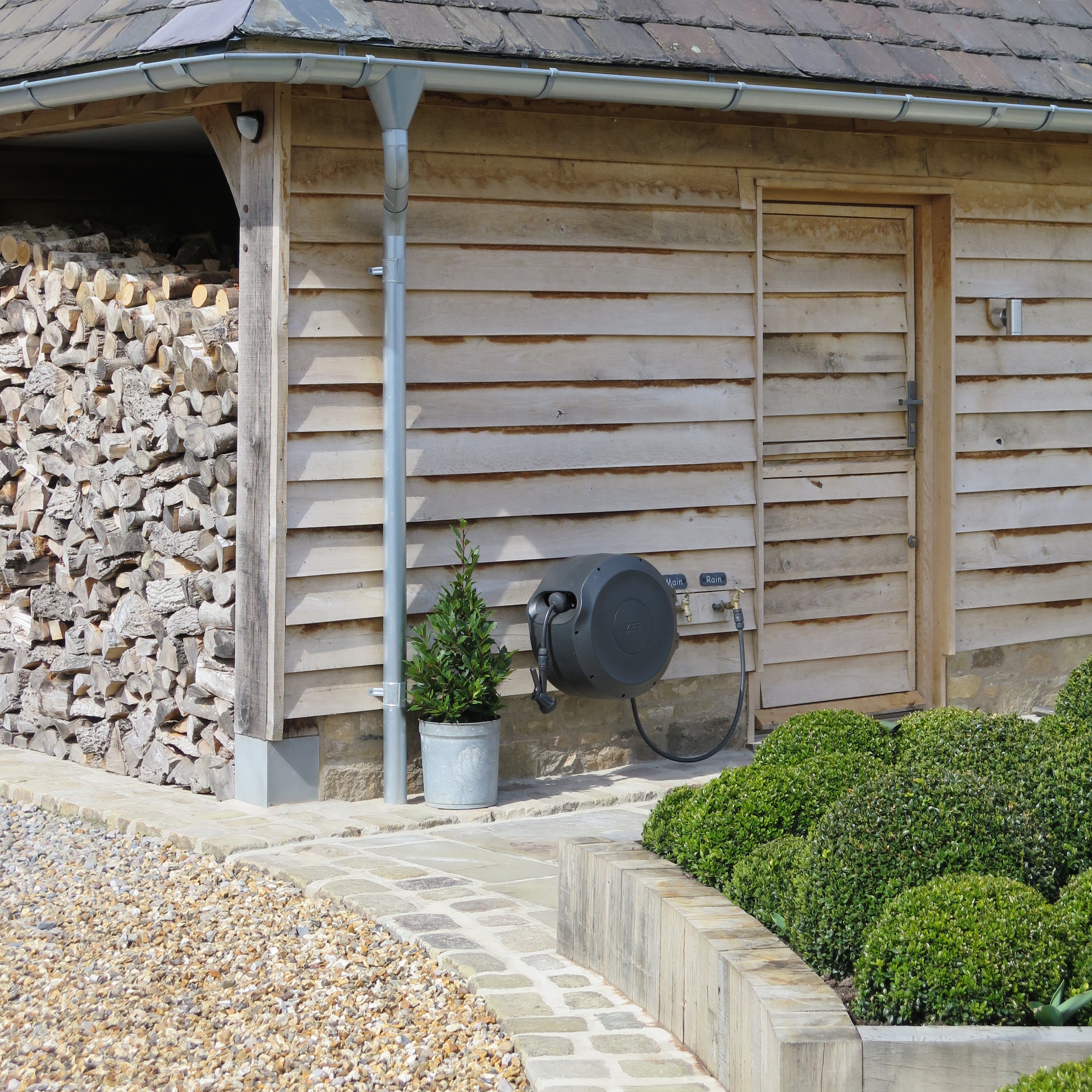 Klaar voor gebruik Elke haspel is compleet met slang, fittingen en spuitstuk. De slang beschikt over aansluitingen die wereldwijd compatibel zijn. Direct klaar voor gebruik dus! De haspel draait 180 graden rond een beugel en kan aan beide kanten tegen de muur worden geplaatst. Hij wordt compleet geleverd met schrioeven en pluggen voor een snelle en eenvoudige montage. Het vloeiende terugspoelsysteem is voorzien van automatische stop en verhoogt het gebruikscomfort.