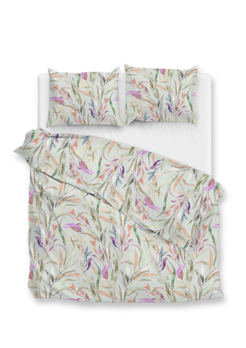Het Zohome Tia dekbedovertrek straalt rust en frisheid uit met een subtiel bladerenpatroon op een zachte lichtgroene achtergrond. Gemaakt van 100% katoen-satijn, voelt het heerlijk zacht en soepel aan, terwijl het ademend en vochtregulerend is voor optimaal slaapcomfort.