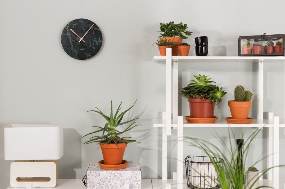 De Zuiver Marble Time Wandklok is bijzonder, chic en veelzijdig. De verfrissende combinatie van de materialen marmer en koper zorgt voor een klassiek en warm design. Een klok die allure toevoegt aan elk interieur. Hang de klok in de eetkamer, woonkamer, hal of slaapkamer. De klok werkt op één AA batterij.